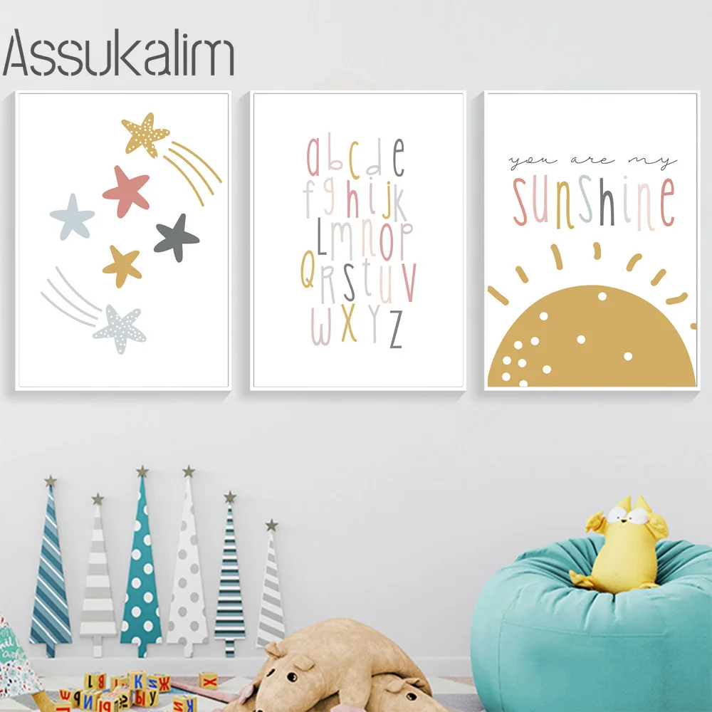 Абс плакат с алфавитом, Скандинавская живопись, солнце, звезда, принт, Детская Настенная картина, рисунок на холсте, радуга, художественные картины, украшение детской комнаты