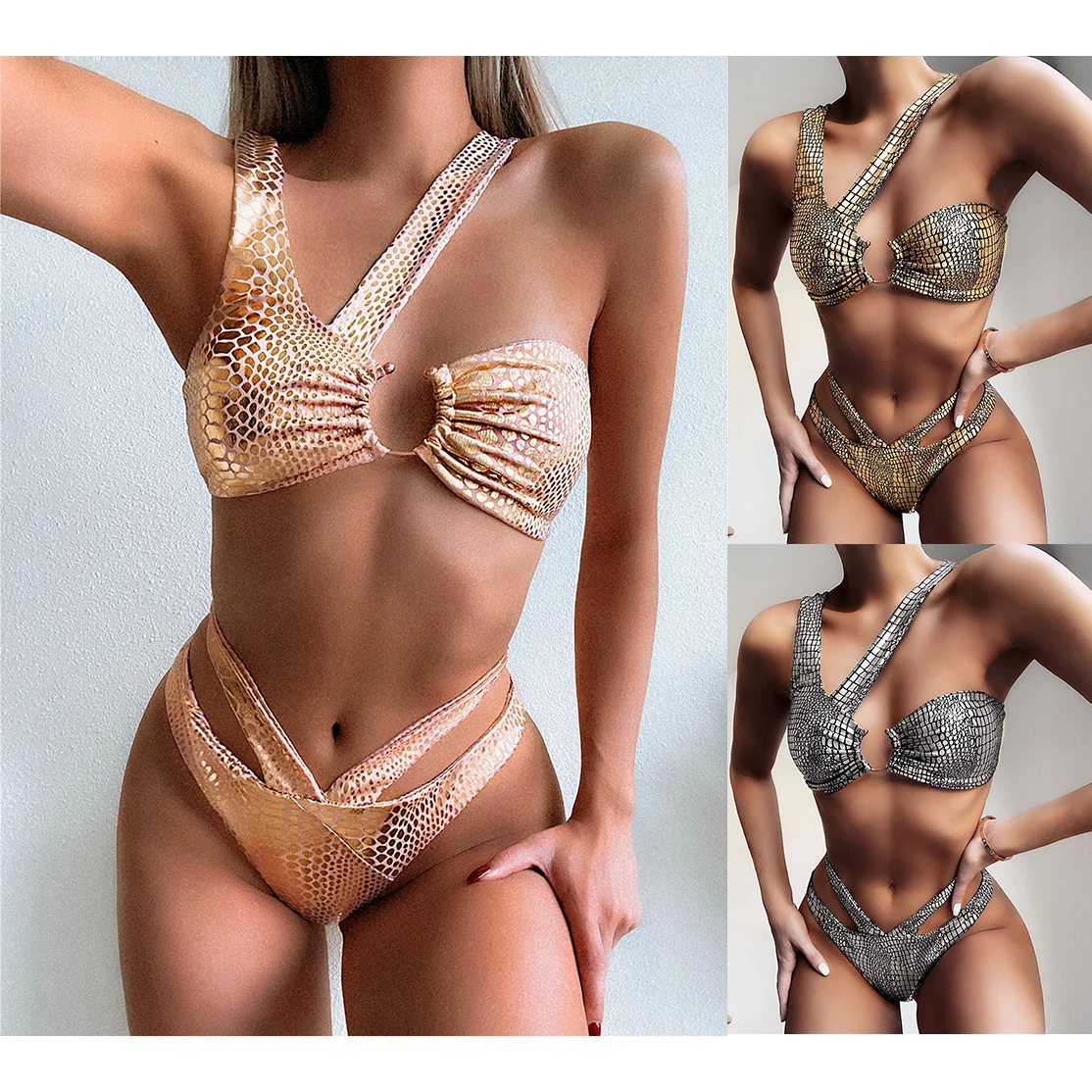 Новинка 2020, комплект бикини hirigin с золотым принтом, женская одежда для плавания, популярный летний Блестящий купальный костюм, бюстгальтер на одно плечо, плавки, бикини