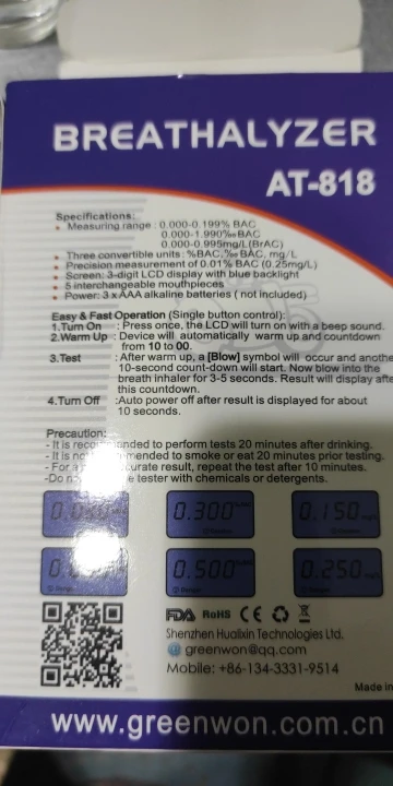 Все працює. Навіть правдоподібно показує. Тверезий 0, відразу після пива 0.88 і поступово зменшується. Коробка була пом'ята, але прилад цілий. За ціною менше 3$ як він обійшовся однозначно рекомендую! Інструкція RU EN.