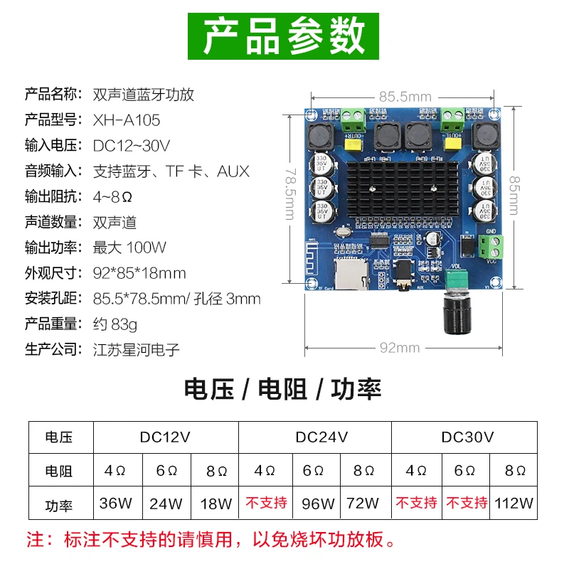 XH-A105 плата цифрового усилителя мощности с высокой точностью и двухканальным стерео качеством звука; Входное напряжение-12 ~ 24 В постоянного тока, аудио вход поддерживает Bluetooth, tf-карту, AUX 3,5 мм аудио линейный вход, может быть непосредственно подключен к мобильному телефону, MP3 и т. д.; Плата усилителя мощности также поставляется с функцией регулировки громкости, Который вращает потенциометр chirp по часовой стрелке для увеличения и против часовой стрелки для уменьшения.