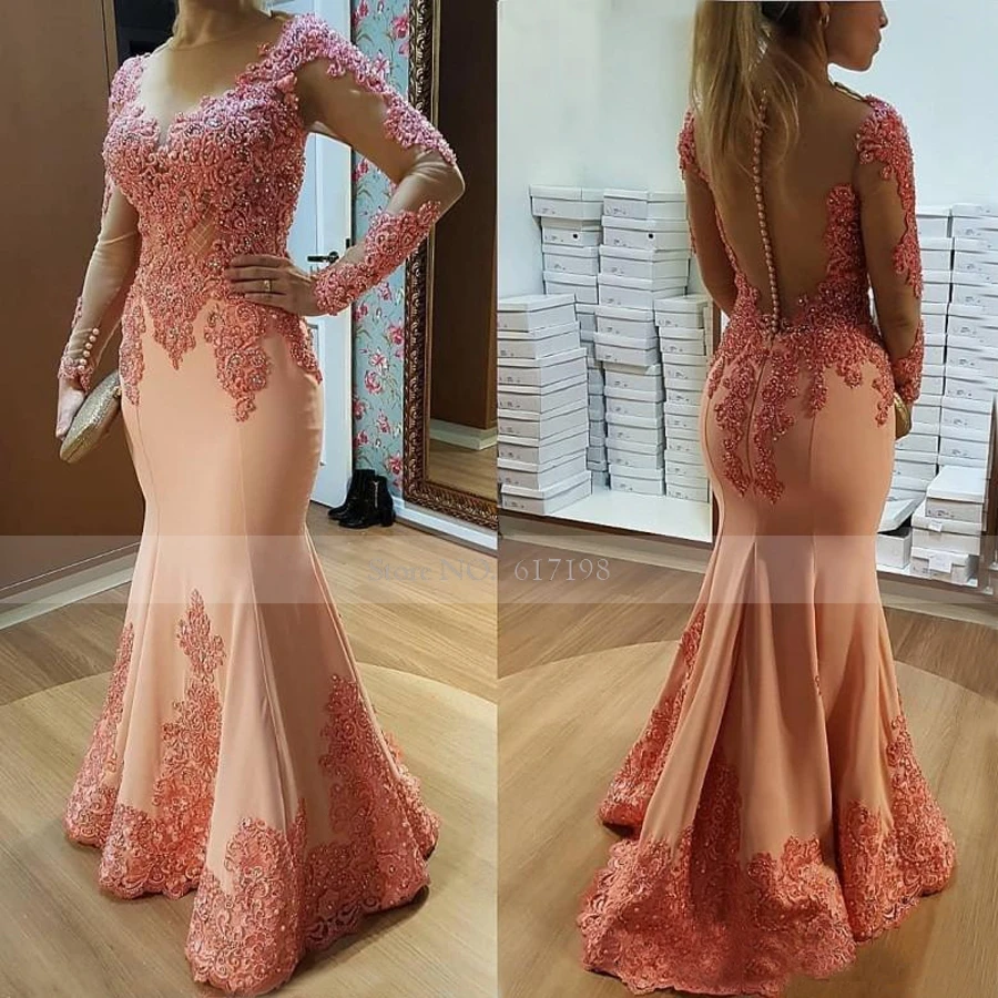 Женское вечернее платье с длинным рукавом, элегантное Прозрачное платье-Русалка с О-образным вырезом и бусинами в виде яблока, 2020