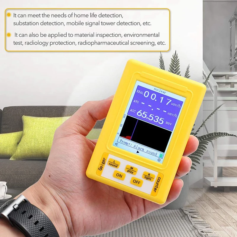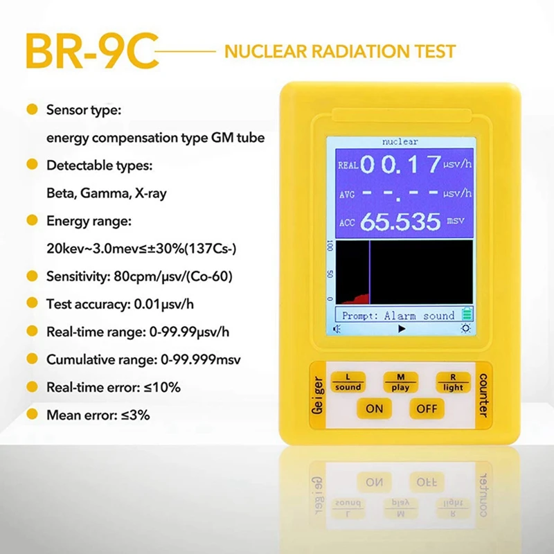Большой экран облегчает Считывание данных, и кнопки просты в эксплуатации.Корпус изготовлен из высококачественного АБС-пластика, который обладает высокой термостойкостью и холодным сопротивлением, высокой прочностью и тонкой прочностью.Высокая чувствительность, широкий диапазон измерений, имеет длительный срок службы.Электромагнитное излучение и атомное излучение могут быть обнаружены. Он может удовлетворить потребности в домашнем обнаружении жизни, обнаружении подстанций, обнаружении башни мобильного сигнала и т. д. он также может быть применен для проверки материала, экологического теста, радиологической защиты, радиофармацевтического скрининга и т. Д.С выключением звука, будильником, кнопкой выбора звука частиц, тестом, значением сброса значения, кнопкой выбора ретеста, подсветка может быть включена или выключена.Характеристики:Материал: АБС-пластикЦвет: желтыйМодель: BR-9CРазмер экрана: 57*43 мм/2,2*1,7 дюймаТест электромагнитного излучения:Диапазон испытаний:Плотность мощности: 0-99.999μw/c㎡Интенсивность электрического поля: 0-999,99 в/мИнтенсивность магнитного поля: 0-99.999μTТочность теста:Плотность мощности: 0,001 W/c㎡Интенсивность электрического поля: 0,01 В/мИнтенсивность магнитного поля: 0.001μTЧастотный диапазон:Плотность мощности: 50 МГц-5 ГГцИнтенсивность электрического поля: 20 Гц-100 МГцИнтенсивность магнитного поля: 20 Гц-1 МГцИспытание ядерной радиации:Тип датчика: Тип компенсации энергии GMОбнаруживаемые типы: бета, гамма, рентгеновскийДиапазон энергии: 20kev ~ 3.0mev менее чем равный ± 30%(137Cs-)Чувствительность: 80CPM/μsv/(Co-60)Точность теста: 0,01 мкЗв/чДиапазон в реальном времени: 0-99,99sv SV/чСовокупный диапазон: 0-99.999msvОшибка в реальном времени: менее 10%Средняя погрешность: менее 3%Аккумулятор: аккумулятор 3 * AA 1,5 В или перезаряжаемый аккумулятор 3*1,2 В (не входит в комплект)Зарядка: USB 5V 2A входВремя зарядки: более 4 часовРазмер изделия: 105*70*30 мм/4,1*2,8 * 1.2inПримечание:При преобразовании режима необходимо выключить устройство и повторно войти на страницу выбора.Посылка:1 * Детектор1 * Руководство пользователяТолько вышеуказанная посылка, другие товары не включены.Примечание: светильник и различные дисплеи могут привести к тому, что цвет товара на картинке немного отличается от реального. Допускается погрешность в измерениях +/- 1-3 см.
