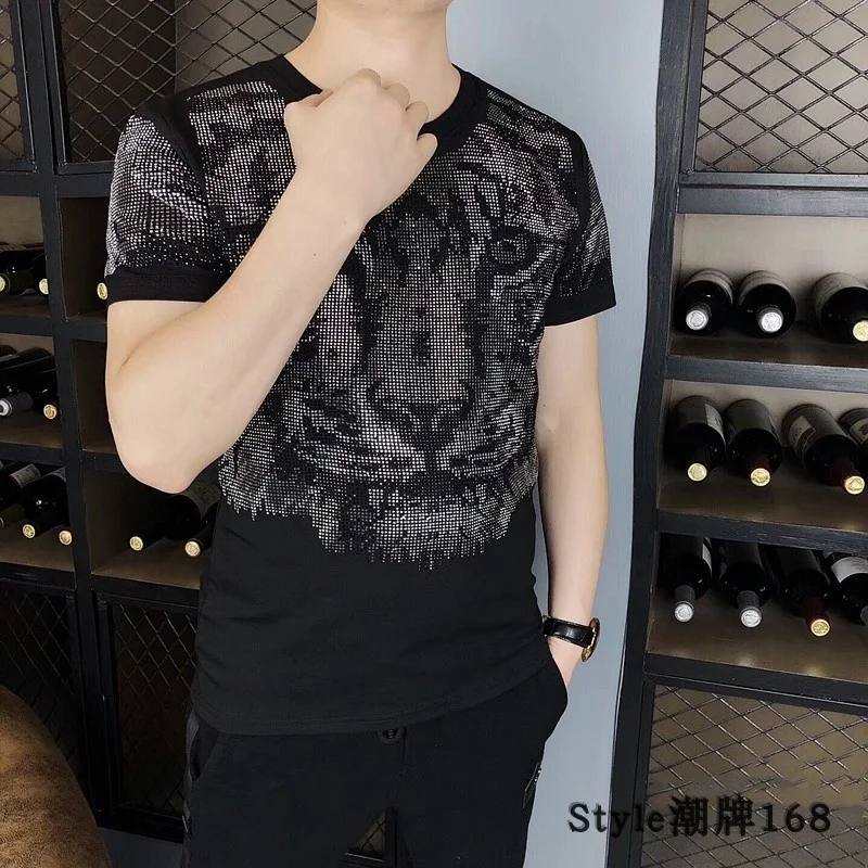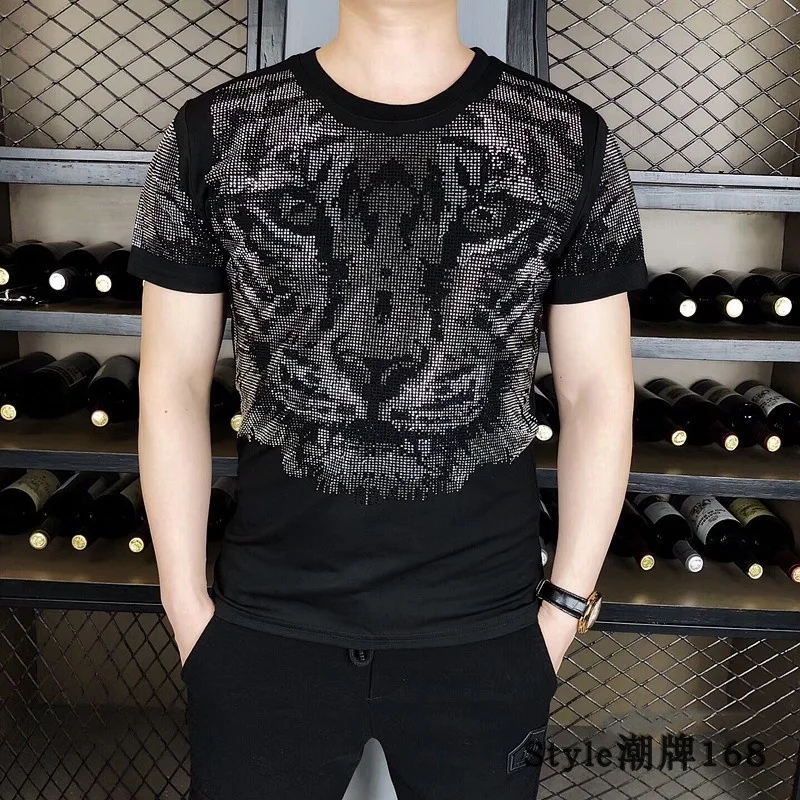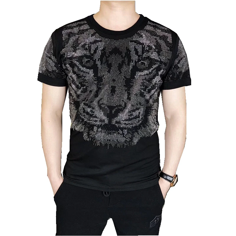 Футболка мужская с короткими рукавами, модная тенниска с головой тигра, со стразами, уличная одежда, повседневная рубашка с круглым вырезом, лето