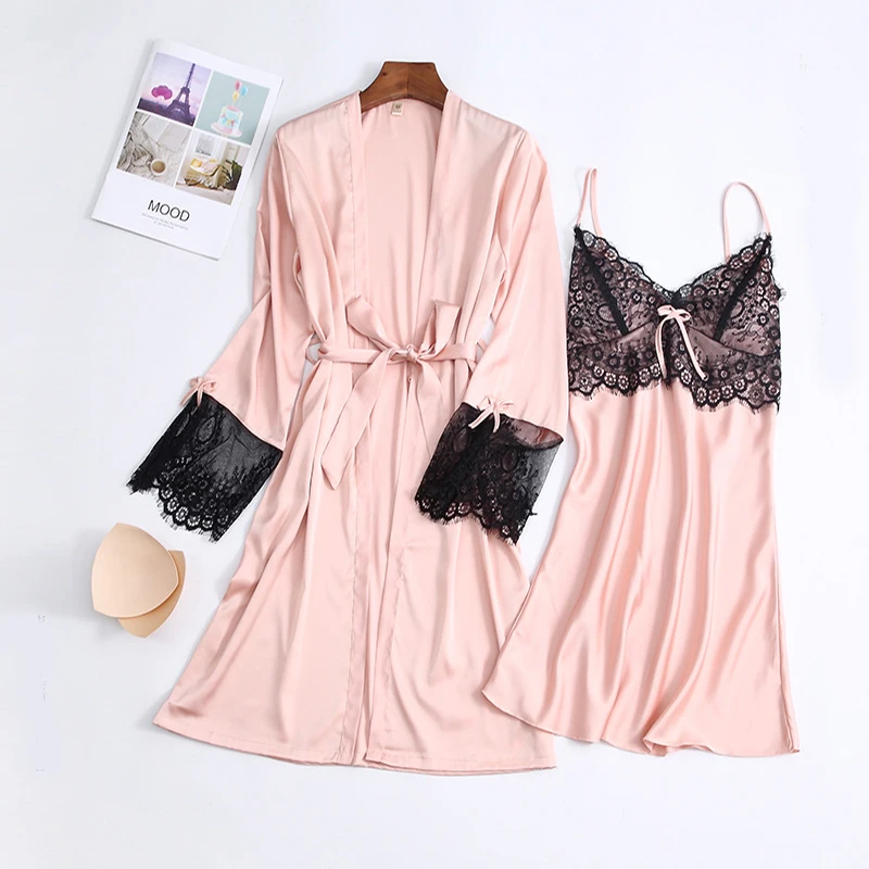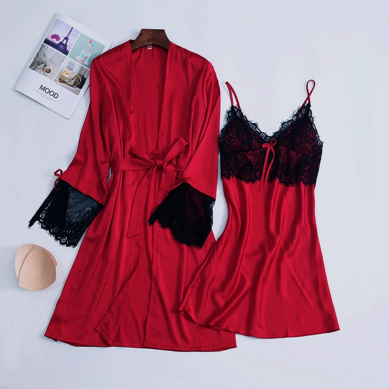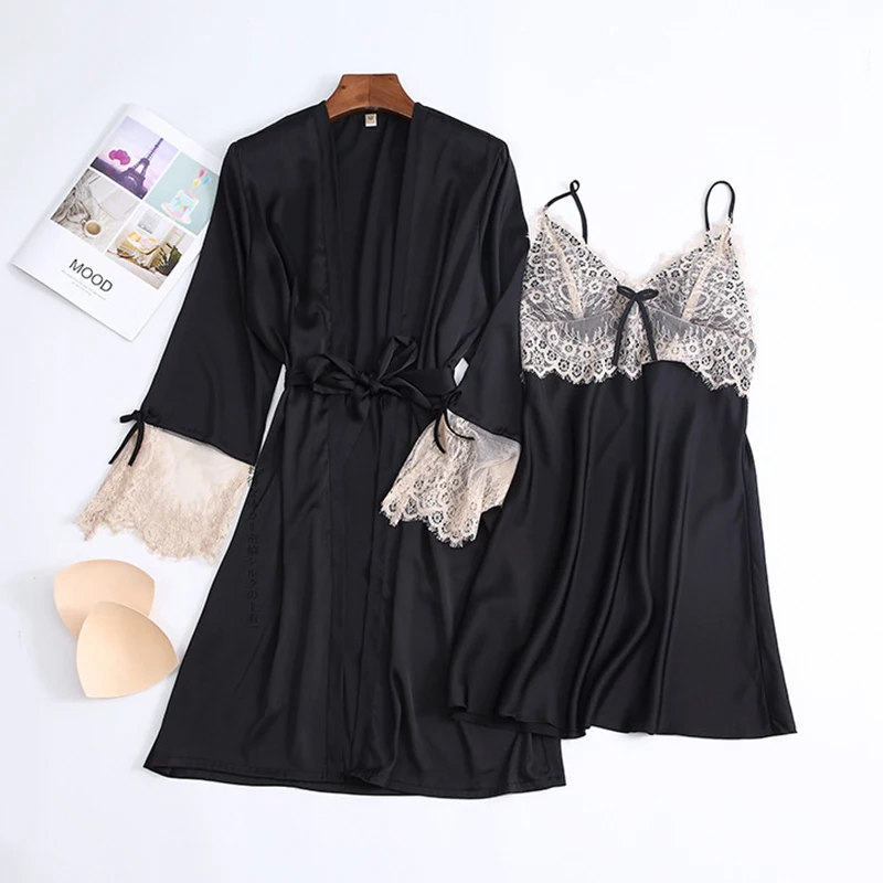 Ночная рубашка женская кружевная атласная, комплект одежды для сна из 2 предметов, с V-образным вырезом, ночная рубашка-кимоно, домашняя одежда для сна, весна