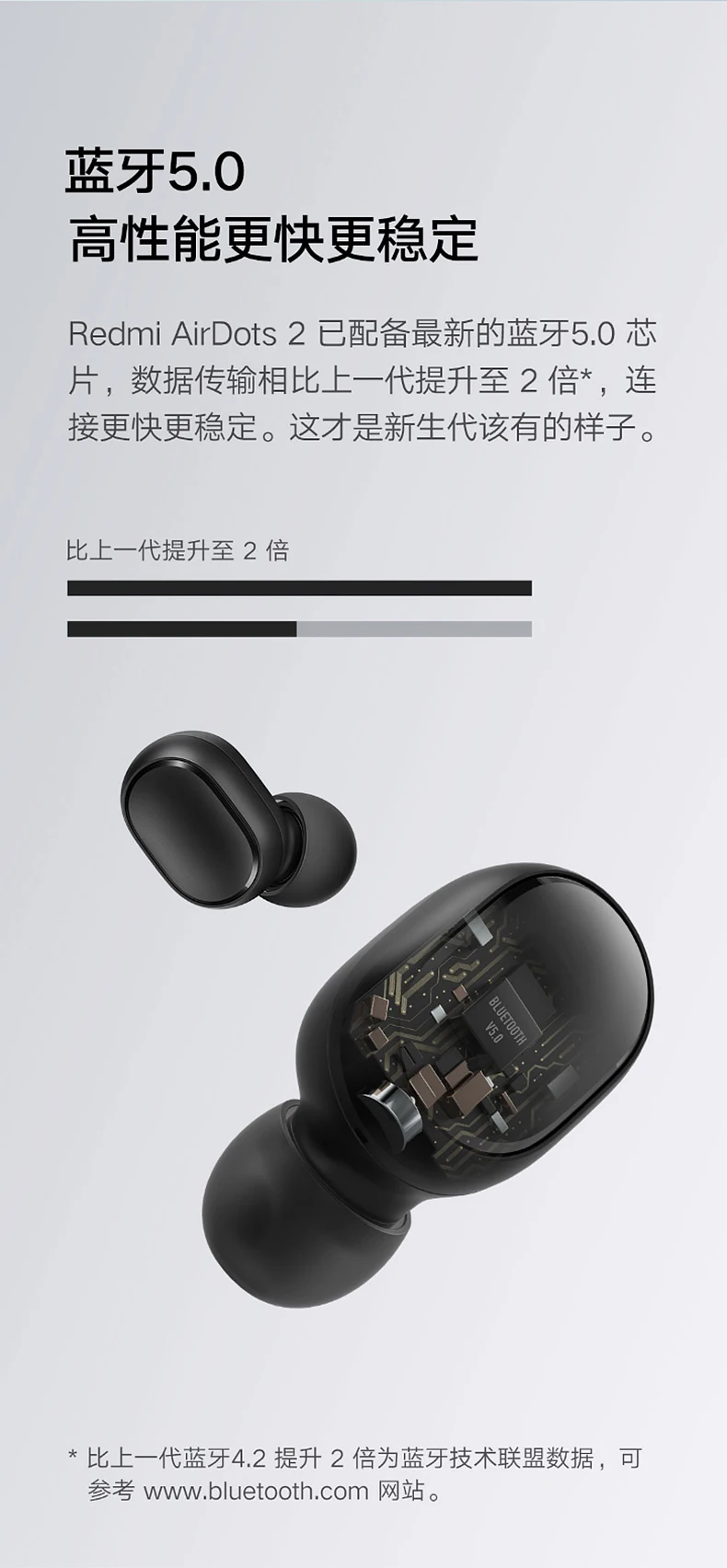 Bluetooth 5,0 Высокая производительность, более быстрая и стабильная Redmi AirDots 2 оснащен новейшим чипом Bluetooth 5,0, передача данных увеличивается в 2 раза * по сравнению с предыдущим поколением, и соединение происходит быстрее и стабильнее. Это то, как должно выглядеть новое поколение. До 2 раз больше предыдущего поколения * По сравнению с предыдущим поколение Bluetooth 4,2, это в 2 раза больше данных Bluetooth Technology Alliance, пожалуйста, обратитесь на веб-сайт www.bluetooth.com.