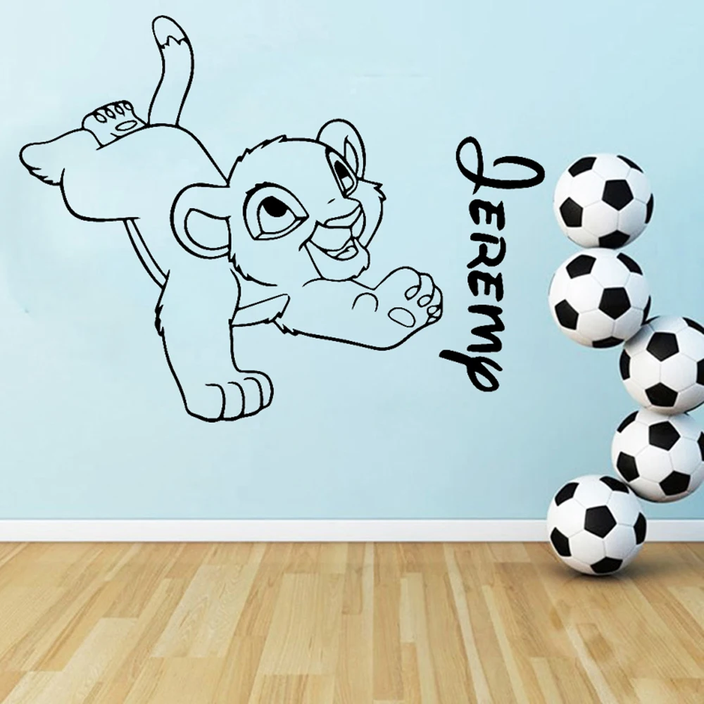 Персонализированная Настенная Наклейка с именем на заказ, Король Лев, Виниловая наклейка, детская спальня, мультяшный декор, милая Simba, декорирование комнаты для малышей