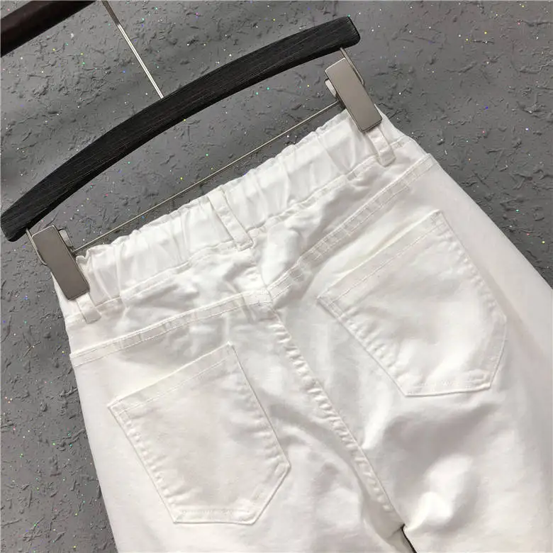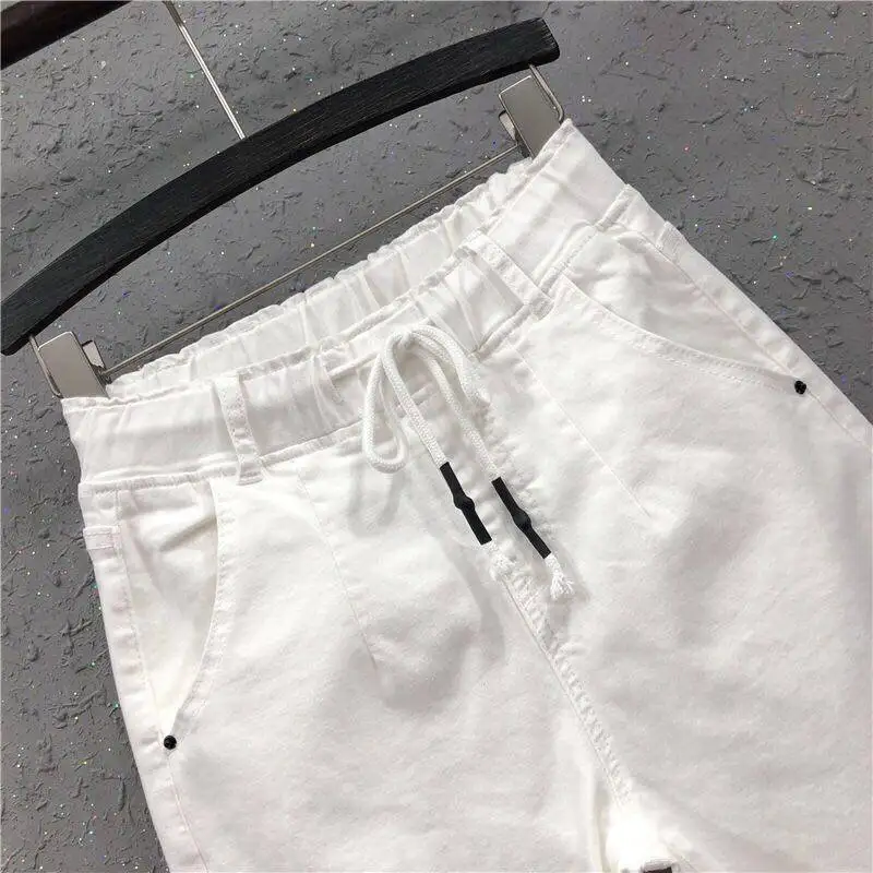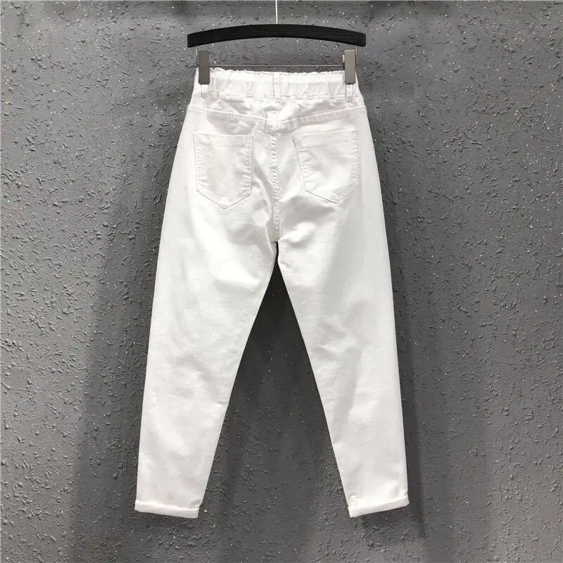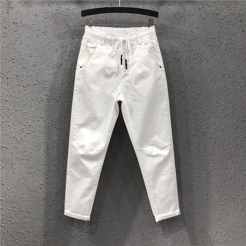 Женские джинсы с эластичным поясом, белые свободные хлопковые брюки...