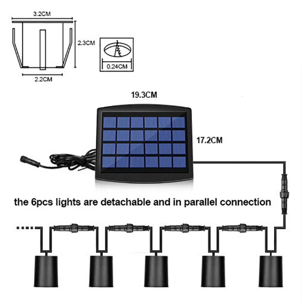 2) используя высокоэффективные солнечные панели, встроенный 3,7 V / 2200mA литиевая батарея, 6/8 огни в одно и то же время, время работы до 16 часов. Яркость делится на два раздела: первые 6 часов, выходной ток 180 мА/ч; Через 6 часов выходной ток 60 мА/ч.