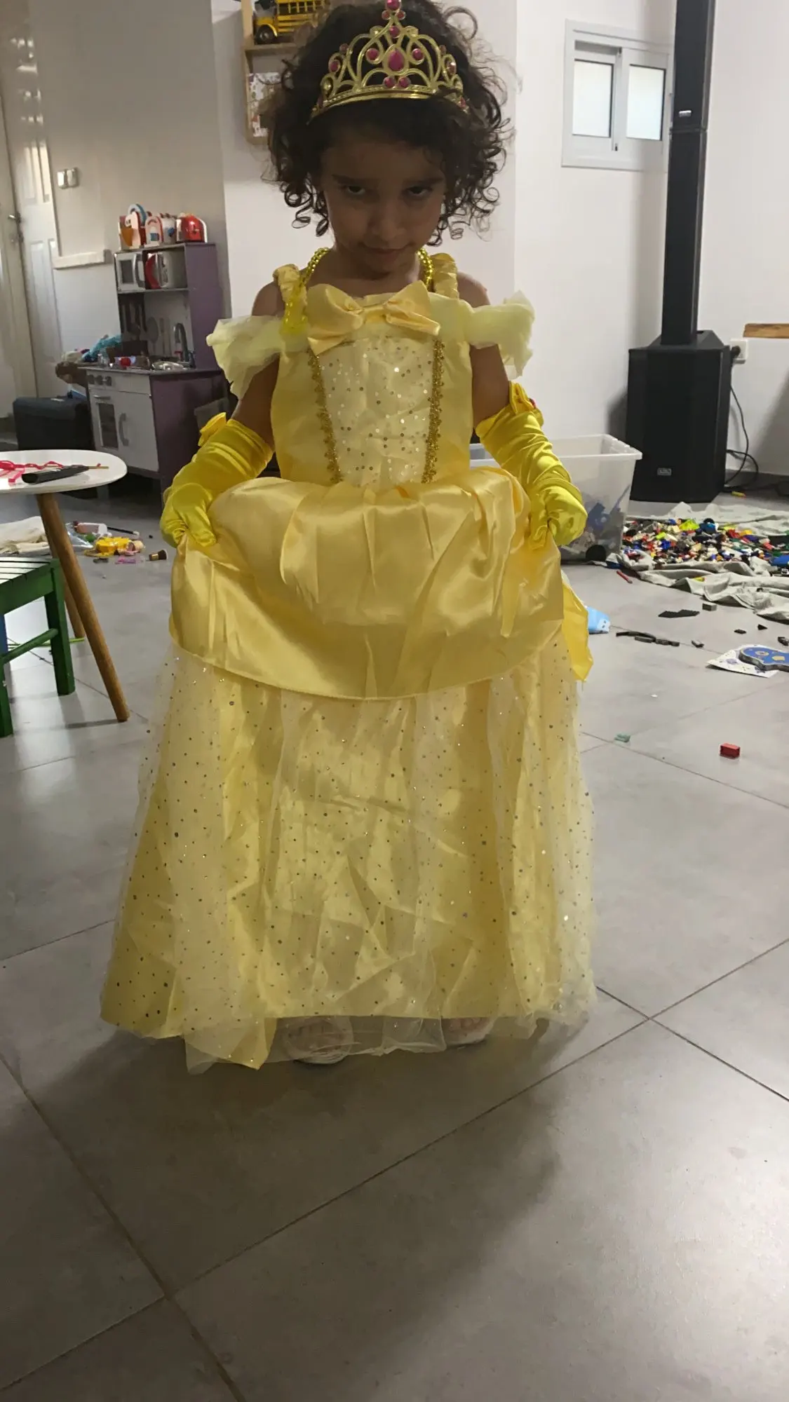Соответствует размеру. Доставка к нам была очень быстрой. Нижняя часть тюля не выглядит так, как на фото, но платье по-прежнему красивое и хорошо сделано. Нужно хорошее нажатие, но это ожидалось.