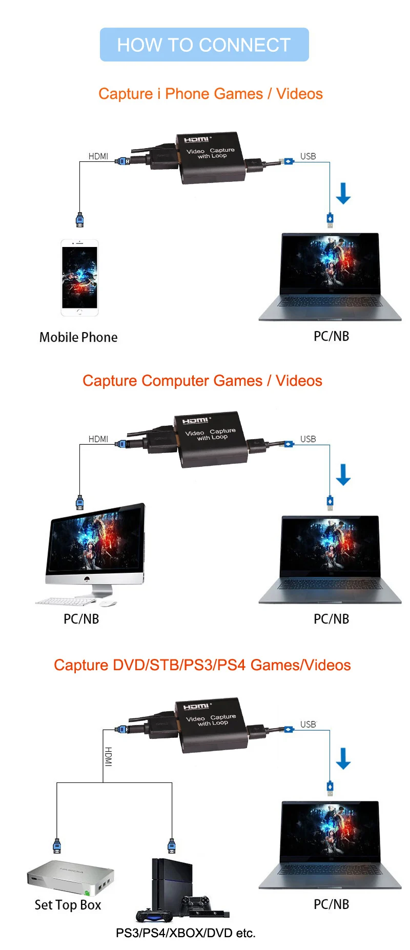 Устройство видеозахвата, 4K, HDMIUSB 2,0, для PS4