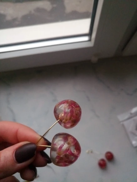 Приехали очень быстро. Буквально за неделю уже в МО. Как на картинке. По виду похожи на высушенные цветы в цветной эпоксидке. Немного тяжеловаты, не на каждый день. Заказом довольна.