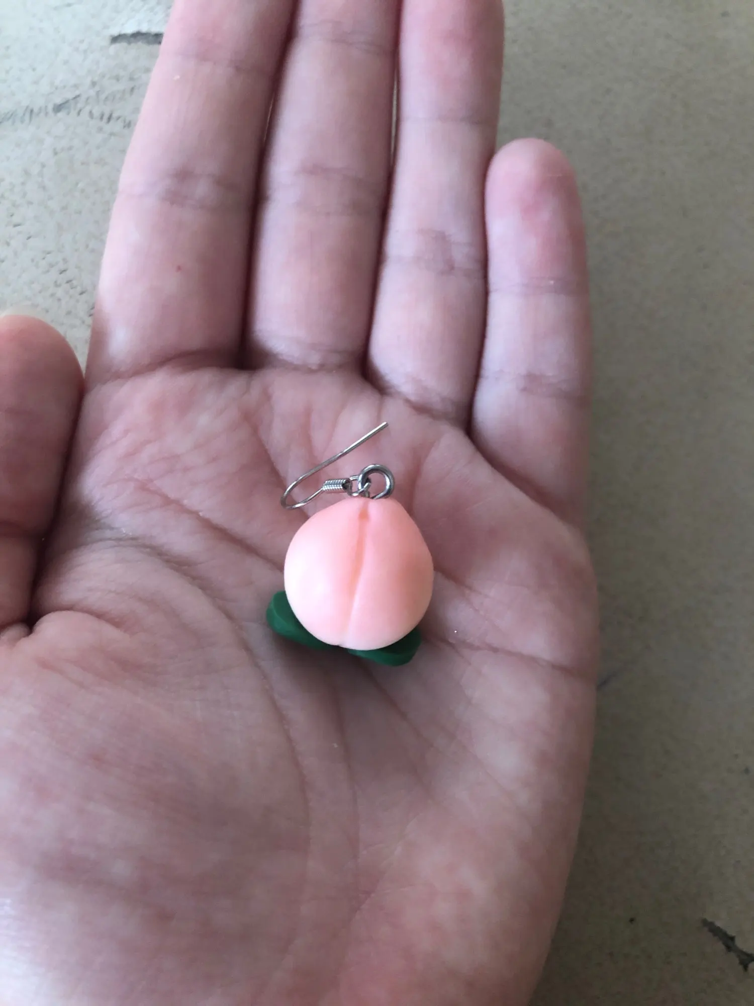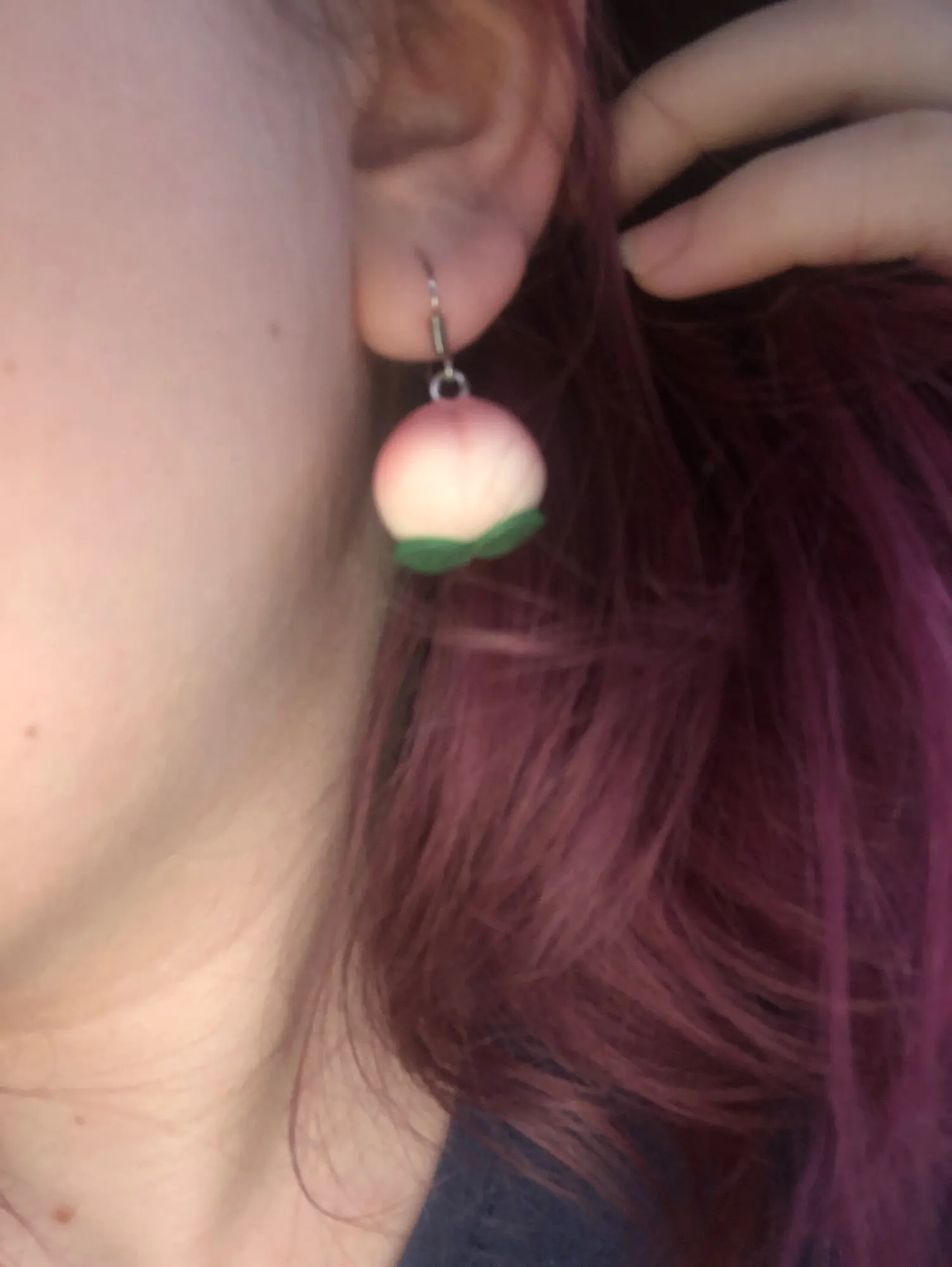 Серьги хорошие, достаточно крупные,так что их видно даже с распушенными волосами, но они не мешают от слова совсем. На самих персиках видны отпечатки пальцев(ручная работа ?), что по-своему мило,хотя листочки могли бы и поаккуратней сделать, но это не так бросается в глаза. К серёжкам положили зажимы.