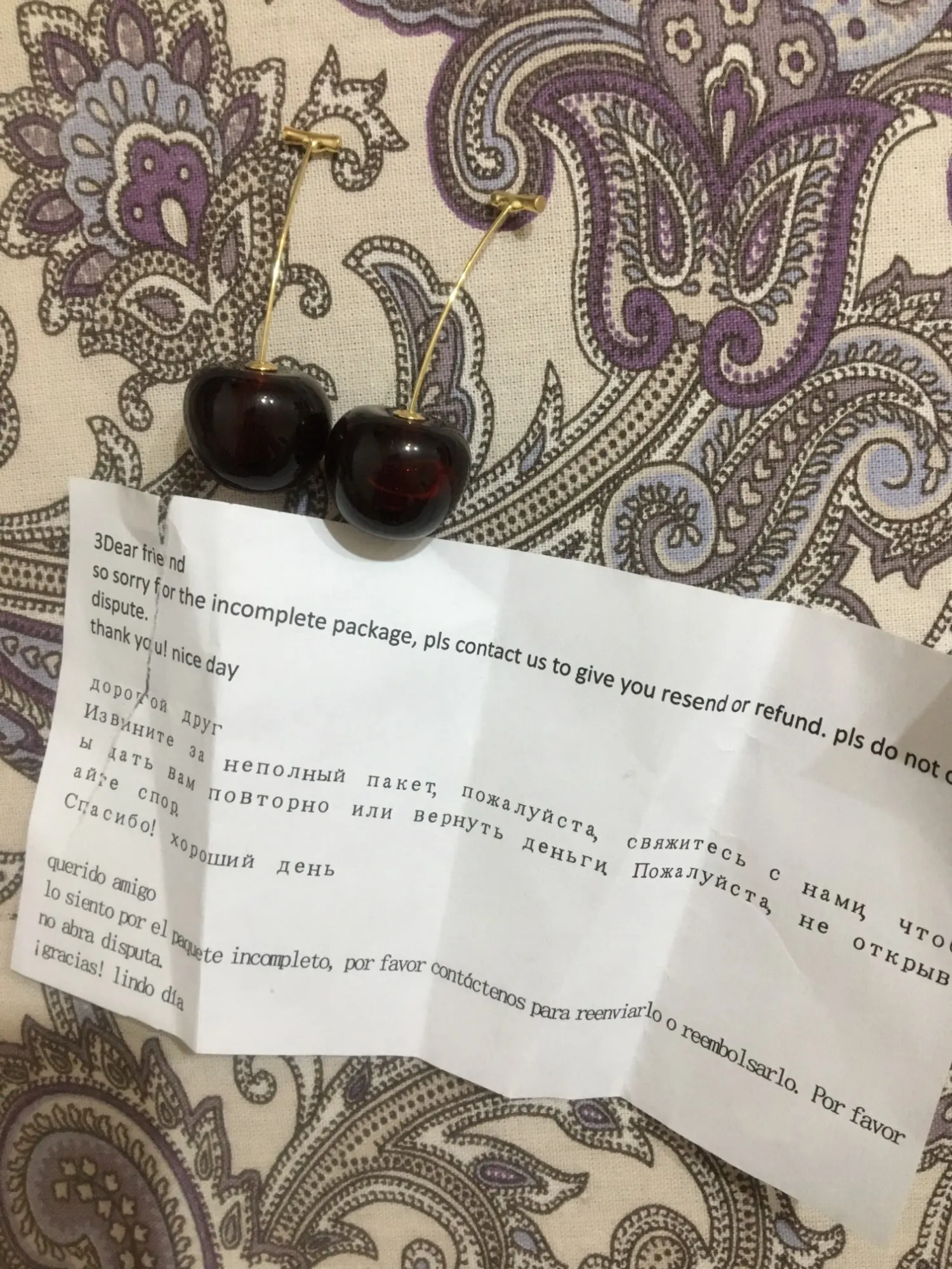 В Минск посылка шла два месяца. Продавец мошенник и обманщик, не заказывайте у него. Кроме этих серёжек заказывала ещё одну пару. Продавец отправил только вишни и не предупредил меня. В посылке была записка с просьбой не открывать спор.