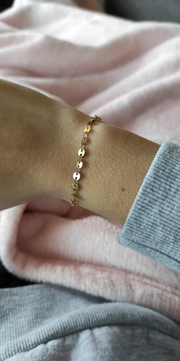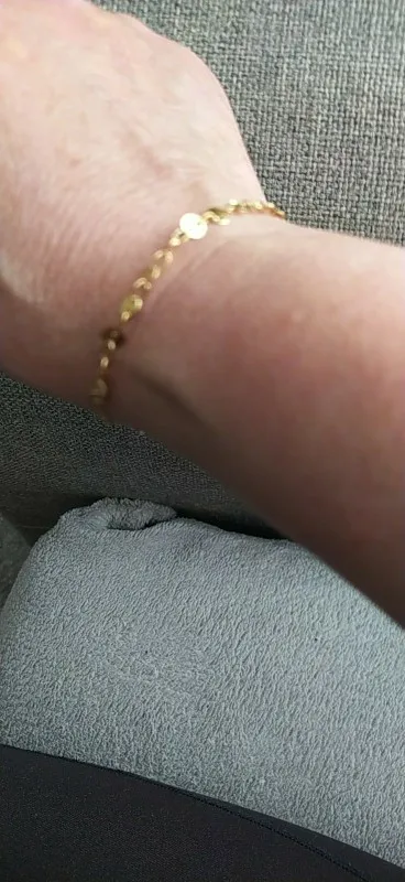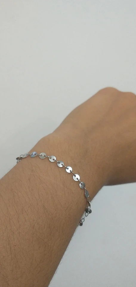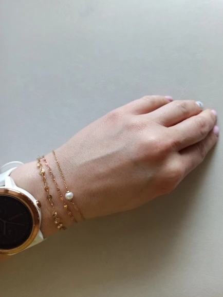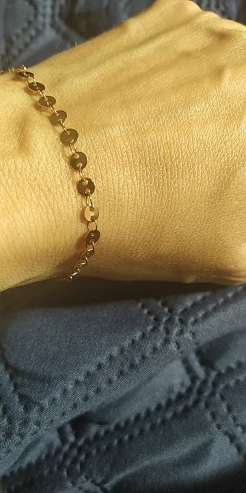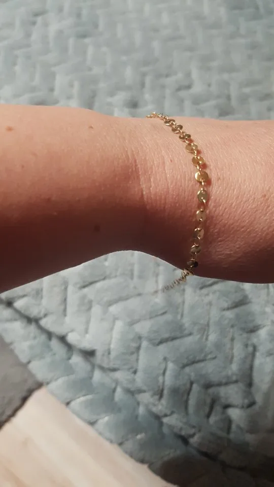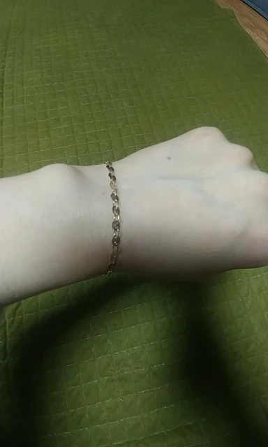 Jest tak ładna, że może być jedyna ozdobą nadgarstka. Nie potrzebuje koleżanek. W porównaniu z innymi bransoletkami od tego sprzedawcy wygląda bardzo ładnie. Moja szerokość nadgarstka to około 16-17cm i bransoletka jest zapięta na ostatnie oczko, nie ma zapasu. Nie wiem czy czarnieje w trakcie noszenia. Dam znać jeśli tak będzie. Wybrałam żółte złoto. Dostawa dość szybko.