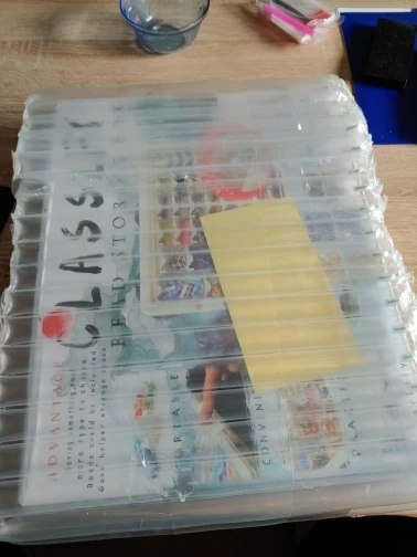 Это прибыло очень хорошо. Очень хорошая упаковка с более жестким пластиком, чем пузырьки вокруг и очень хорошо запечатаны. Имейте в виду, что все коробки одинакового размера и подходят примерно. Около 700 бриллиантов
