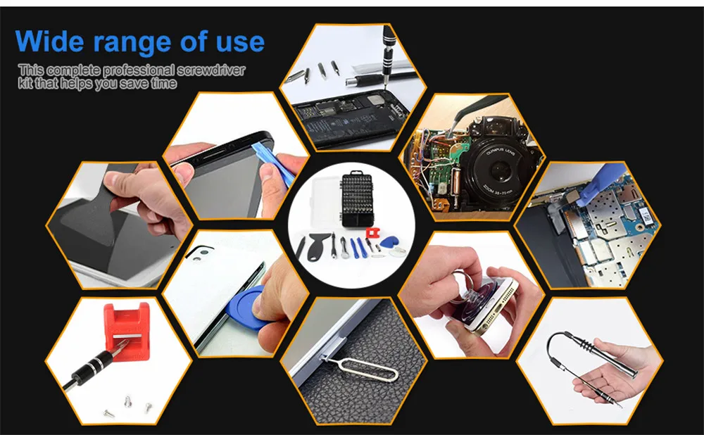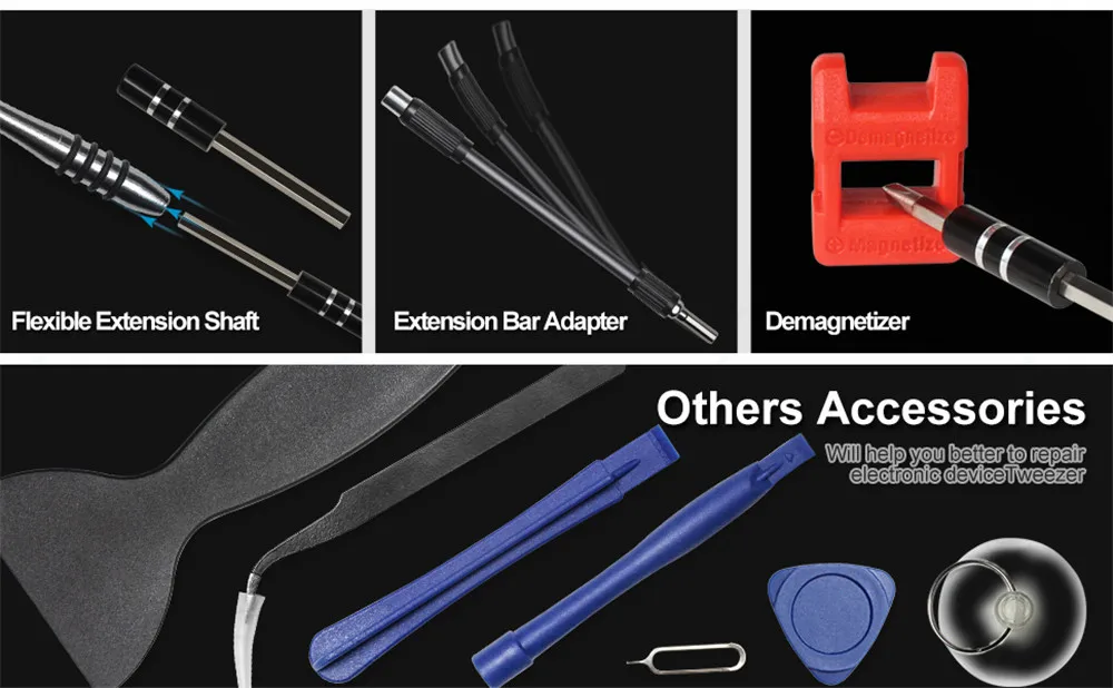 【Легко использовать 】этот прецизионный набор инструментов для ремонта имеет драйвер, Удлинительный вал, адаптер. Вы можете гибко использовать бит в другом направлении. Другие аксессуары, такие как пластиковый бассейн, большая присоска, треугольная прокладка и т. Д., которые помогут вам лучше отремонтировать мобильный телефон, игровую консоль и т. д.