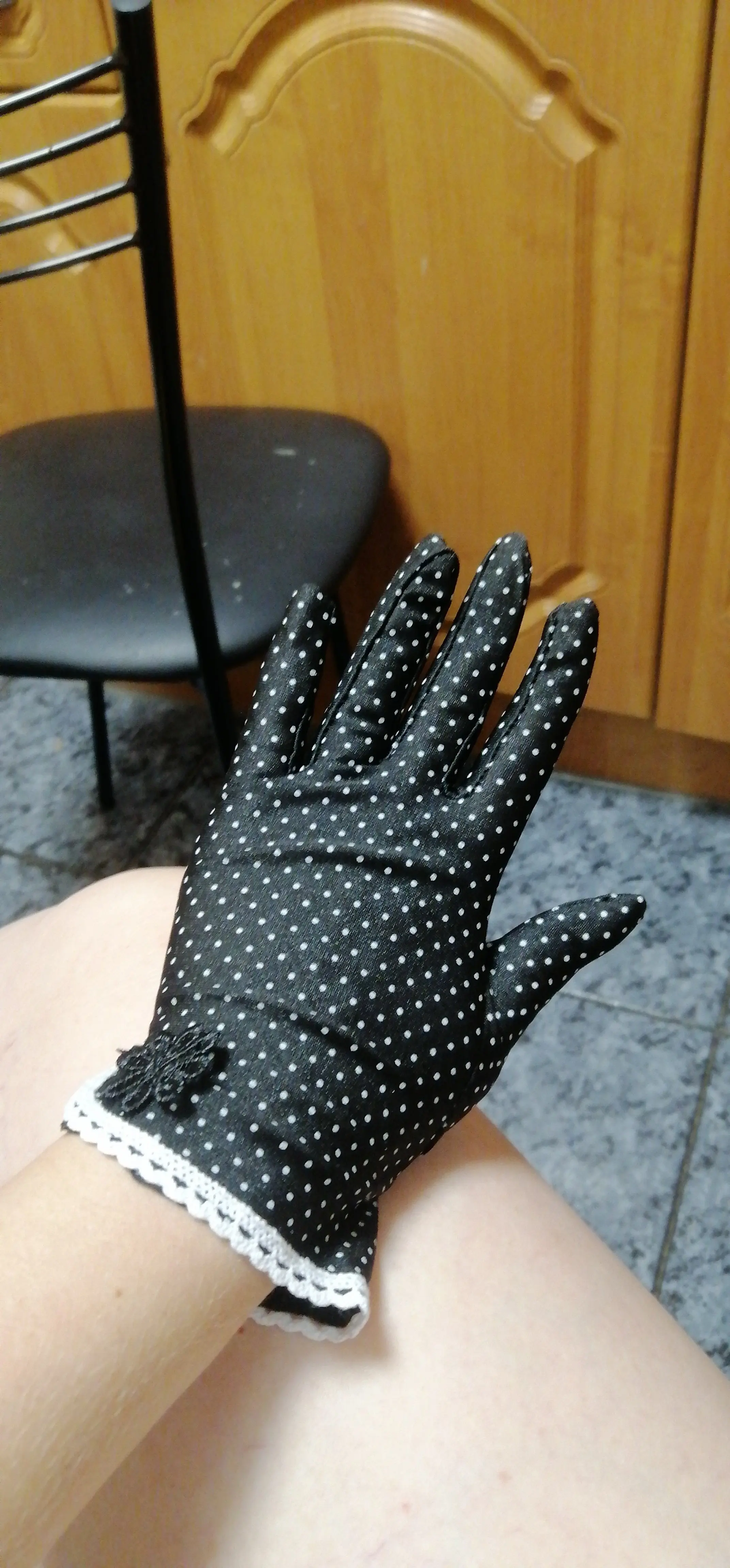 Перчатки понравились. На короткие пальцы сели хорошо. Тянуться не очень. Довольно плотные. Сшиты аккуратно. Кружавчики по краю и цветочек добавляют женственности. Доставка была в объединенной посылке до Москвы 18 дней. Продавцу спасибо!