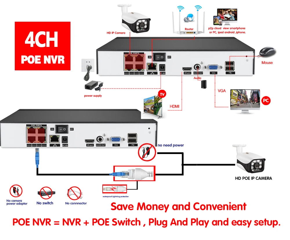POE NVR FeaturesHDMI&VGA output / Motion detection/email Alert..