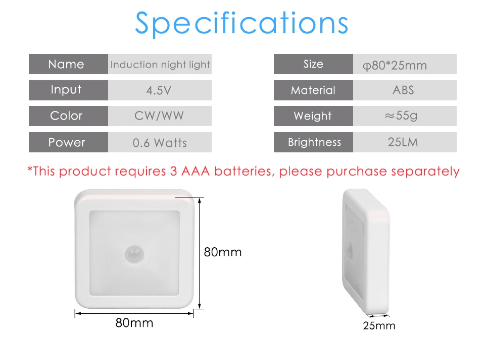 Источник питания: питание от аккумулятораДиапазон датчика движения: до 10 футовРабочая температура: от-20 до 40 градусов ЦельсияСрок службы лампы: 10000 часов.Рабочее напряжение: 4,5 вРазмер: 80*25 ммМатериал: АБС-пластикМощность: 0,6 WЦвет: холодный белый/теплый белый