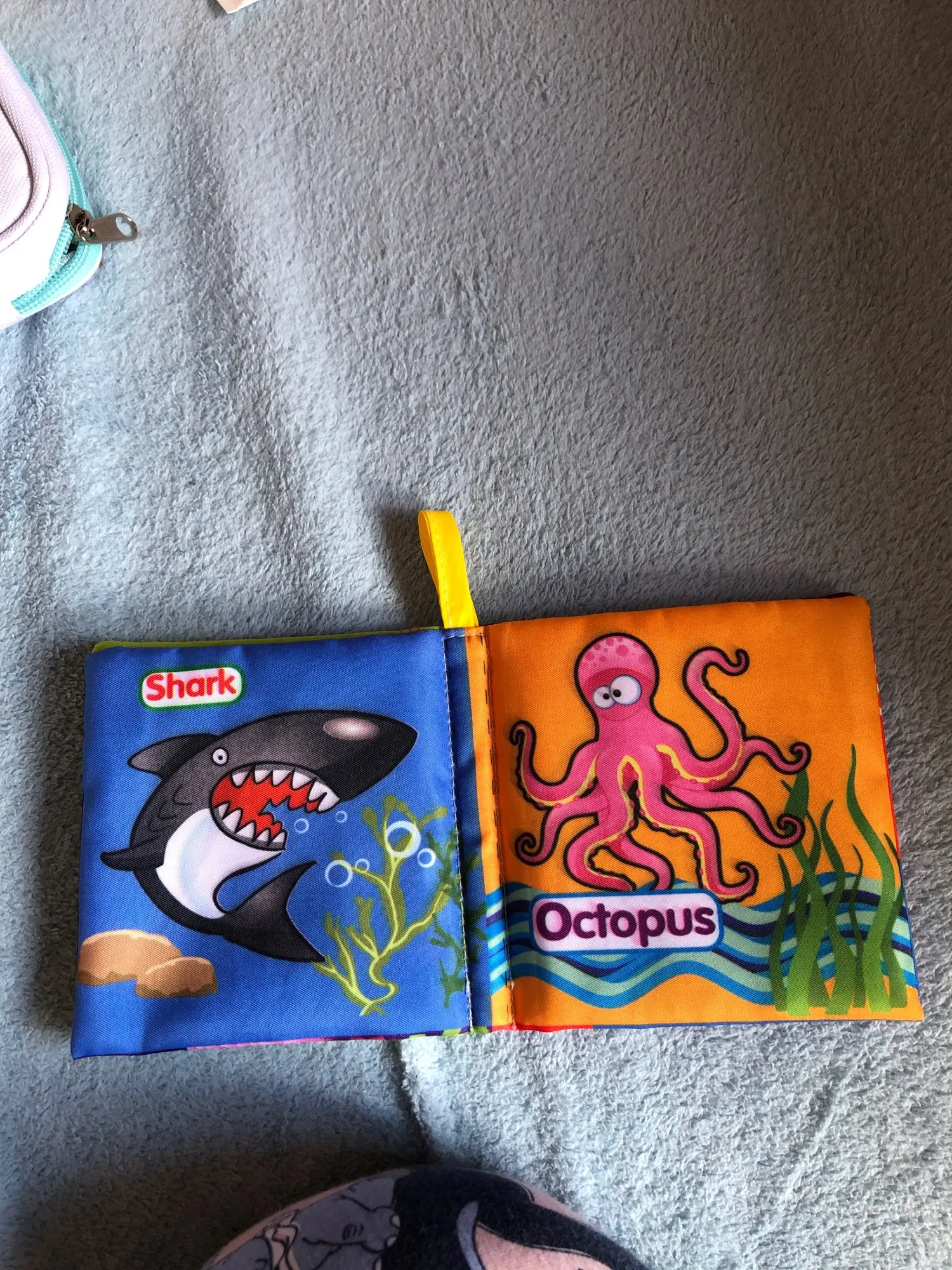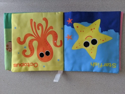 5개월 아기 바스락거리는걸 좋아하지만 물고빨고는 잘 안 하네요 삑삑 소리나는게 들어있어요. 한번씩 앉혀놓고 읽어주면 집중해서 봐요 종류별로 다 사주길 잘한거 같아요.