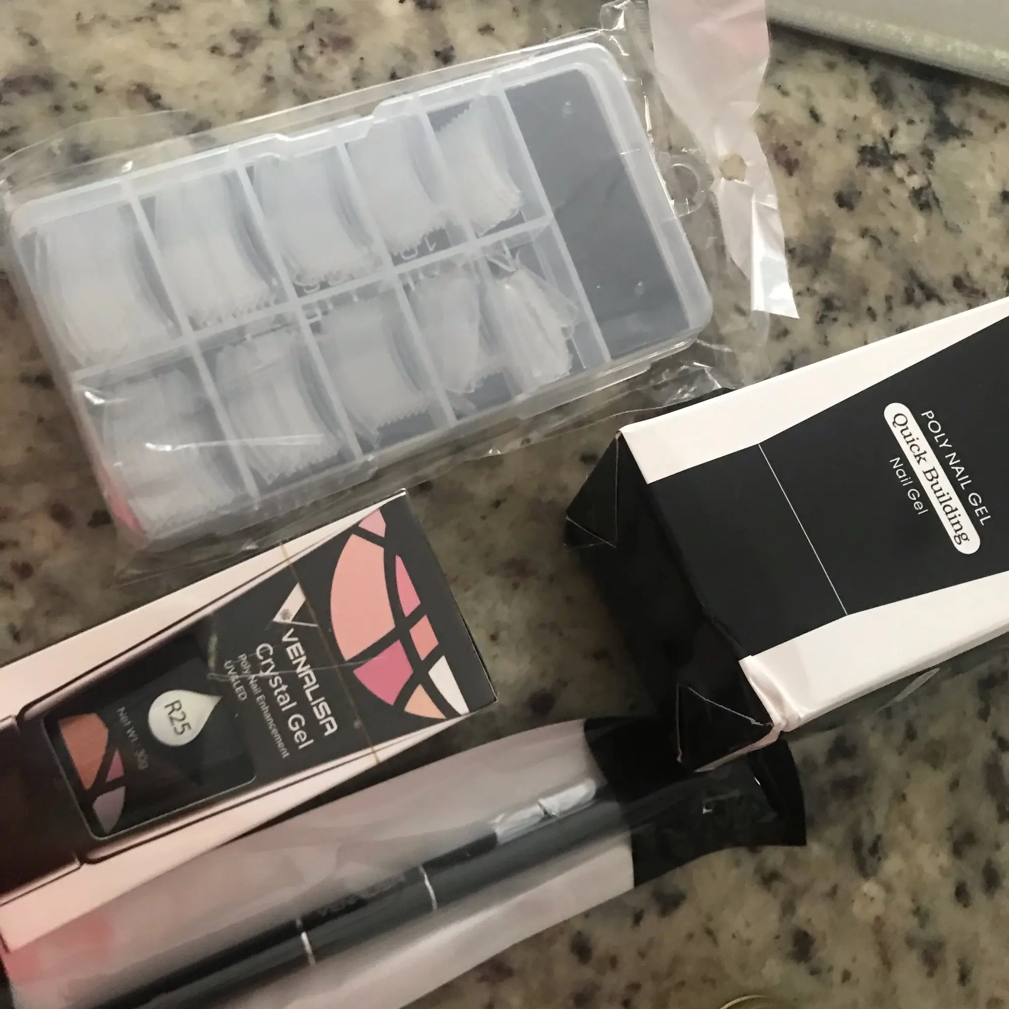 приехало примерно за 3 месяца в Тверь, все коробочки сильно помялись, мономера 75 милилитров, в наборе именно верхние формы, а не жидкие типсы
