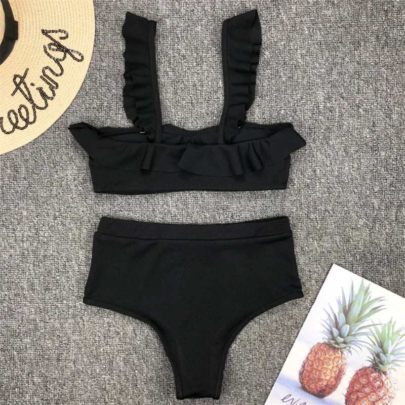 Купальник GNIM женский с высокой талией, бикини с чашками пуш-ап и оборками, черный бразильский купальник, комплект из двух предметов, лето 2020