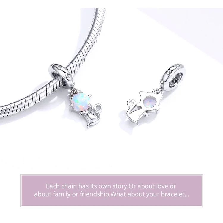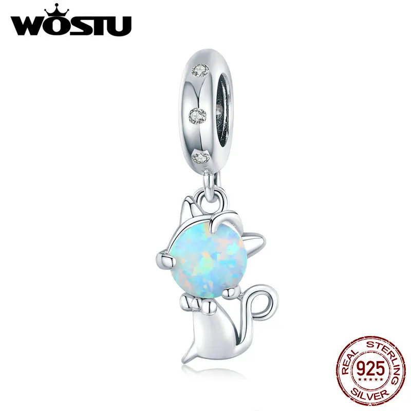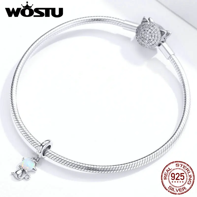 WOSTU милый кот Опал шарик 925 стерлингового серебра Блестящий животных CZ браслеты с подвесками, подходят к оригинальному браслету, кулон ожерелье прекрасные ювелирные изделия CTC235