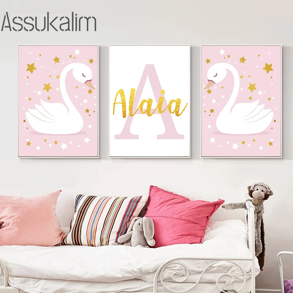 Картина на холсте с лебедями для детской комнаты, настенный художественный постер с именем на заказ, с принтом звезд, цветов, скандинавские настенные картины для маленьких девочек, украшение комнаты