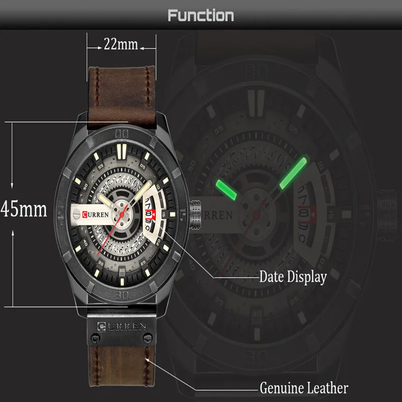 Описание 100% Новый оригинал и высокое качество Отображение даты и времени Креативный модный стиль Оригинальный индивидуальный дизайн Кожаный ремешок 30 м водонагреватель Характеристики кожаного ремешка Материал корпуса: сплав Диаметр корпуса: 45 мм Толщина корпуса: 13 мм Материал ремешка: кожаный ремешок Длина ремешка (включая чехол): 230 мм Ширина ремешка: 22 мм Что входит в комплект 100% оригинальная новинка 1 х Curren Модные повседневные Оригинальные кварцевые часы для мужчин