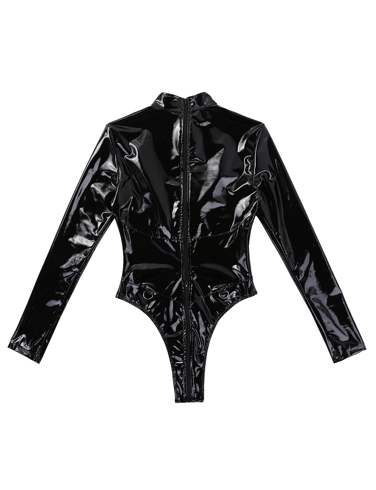 Особенности: Женский Цельный боди из лакированной кожи с высоким вырезом, внешний вид мокрый. Высокий воротник и длинные рукава, двойной конец молнии проходит от задней шеи до передней промежности для одевания и доступа. Металлические d-кольца на шее и высоком бедре для крепления. Изготовлены из легкой и гладкой ткани, мягкие и удобные в носке. Идеально подходит для романтической ночи, танцев, выступления на сцене, клубной одежды, вечерние, ночные вечера и т. д. Пожалуйста, внимательно ознакомьтесь с приведенным ниже размером перед заказом, рекомендуется ручная стирка в холодной воде.