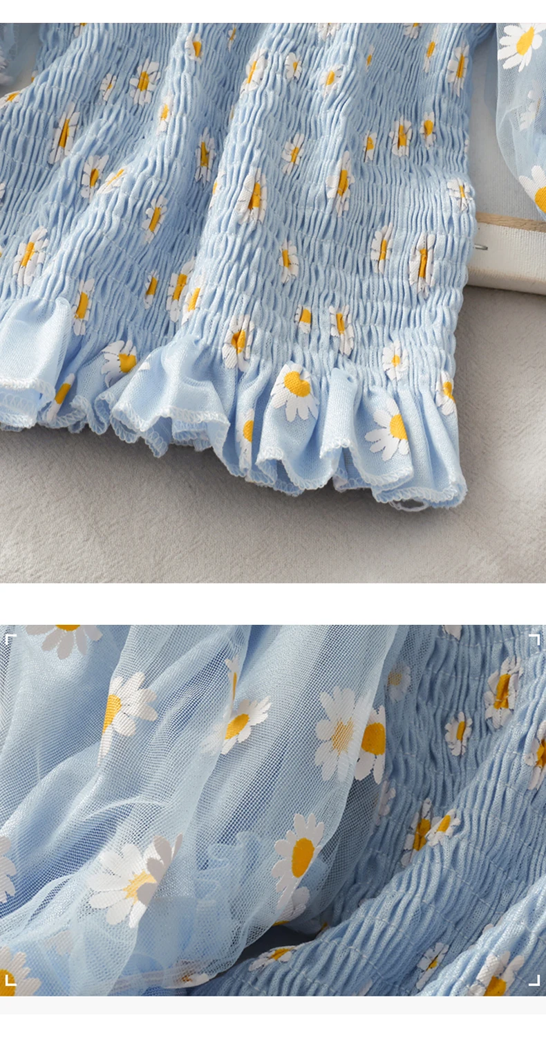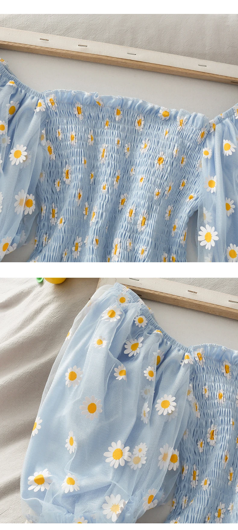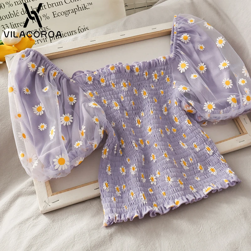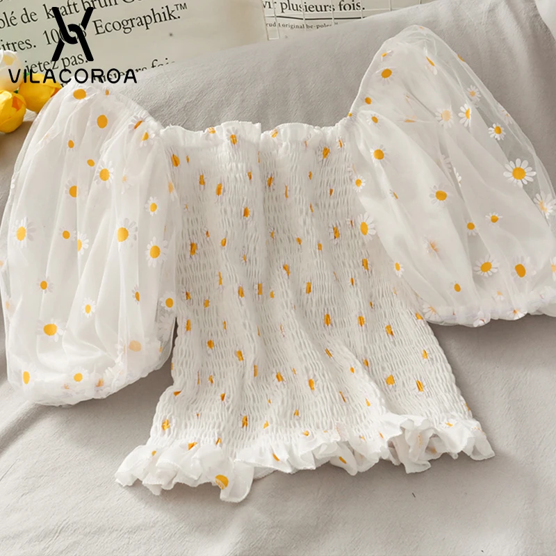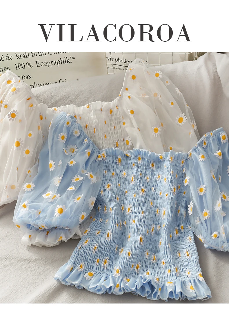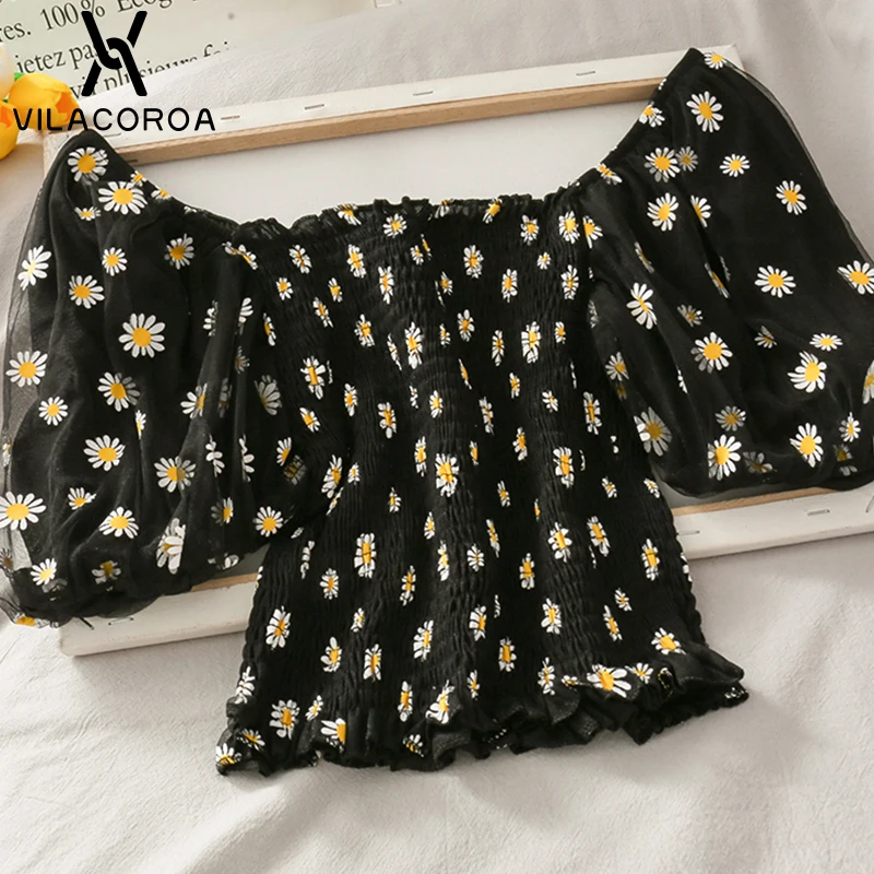 Футболка женская с цветочным принтом, Милая Короткая рубашка с рукавами-фонариками, с вырезом лодочкой, сетчатый топ с маленькими маргаритками, одежда в стиле Харадзюку, на лето