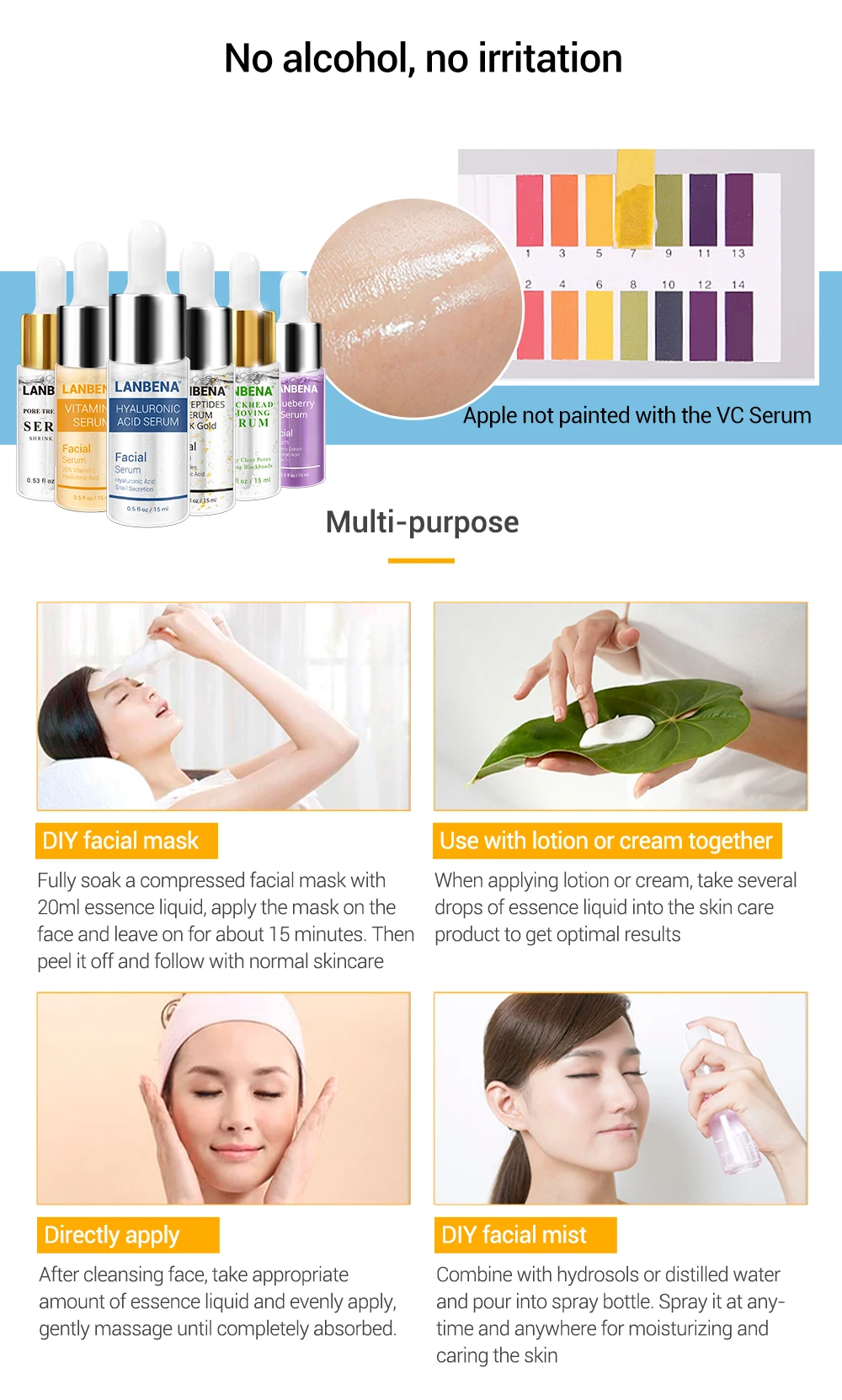 LANBENA Сыворотка для лица эссенция для лица Гиалуроновая кислота увлажнение VC отбеливание сокращение пор 24K золото против старения лечение акне уход за кожей 15 мл