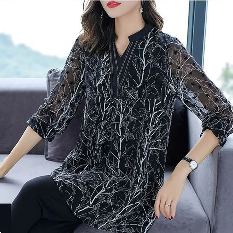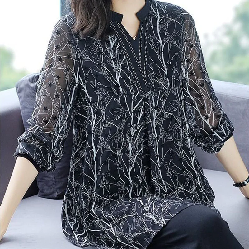 Женская шифоновая блузка, свободная рубашка с длинным рукавом и принтом, весна-лето, DF3618, размера плюс