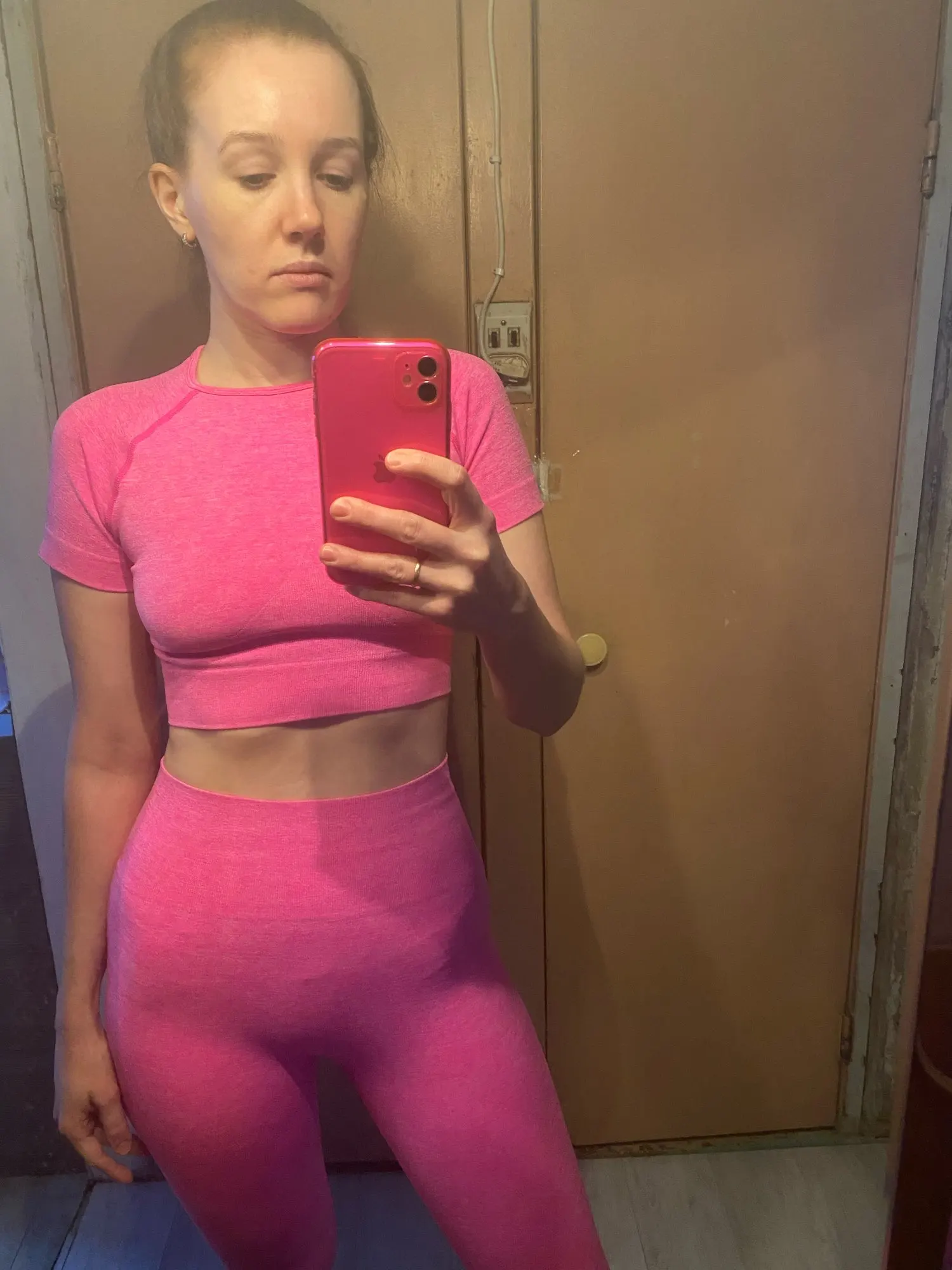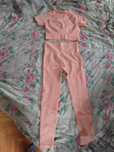 Приятный цвет (светло-персиковый), удобная одежда. Приятно работать в них. Очень нравится! Идеально подходит. Черный цвет немного виден под брюками, но его можно ожидать с таким светлым цветом-и я тренируюсь дома, так что это не беспокойтесь.