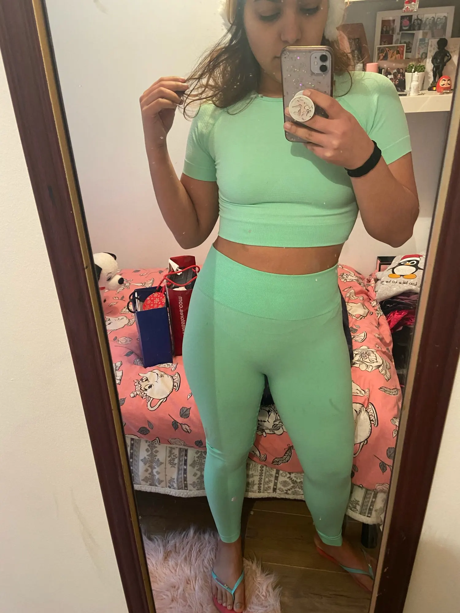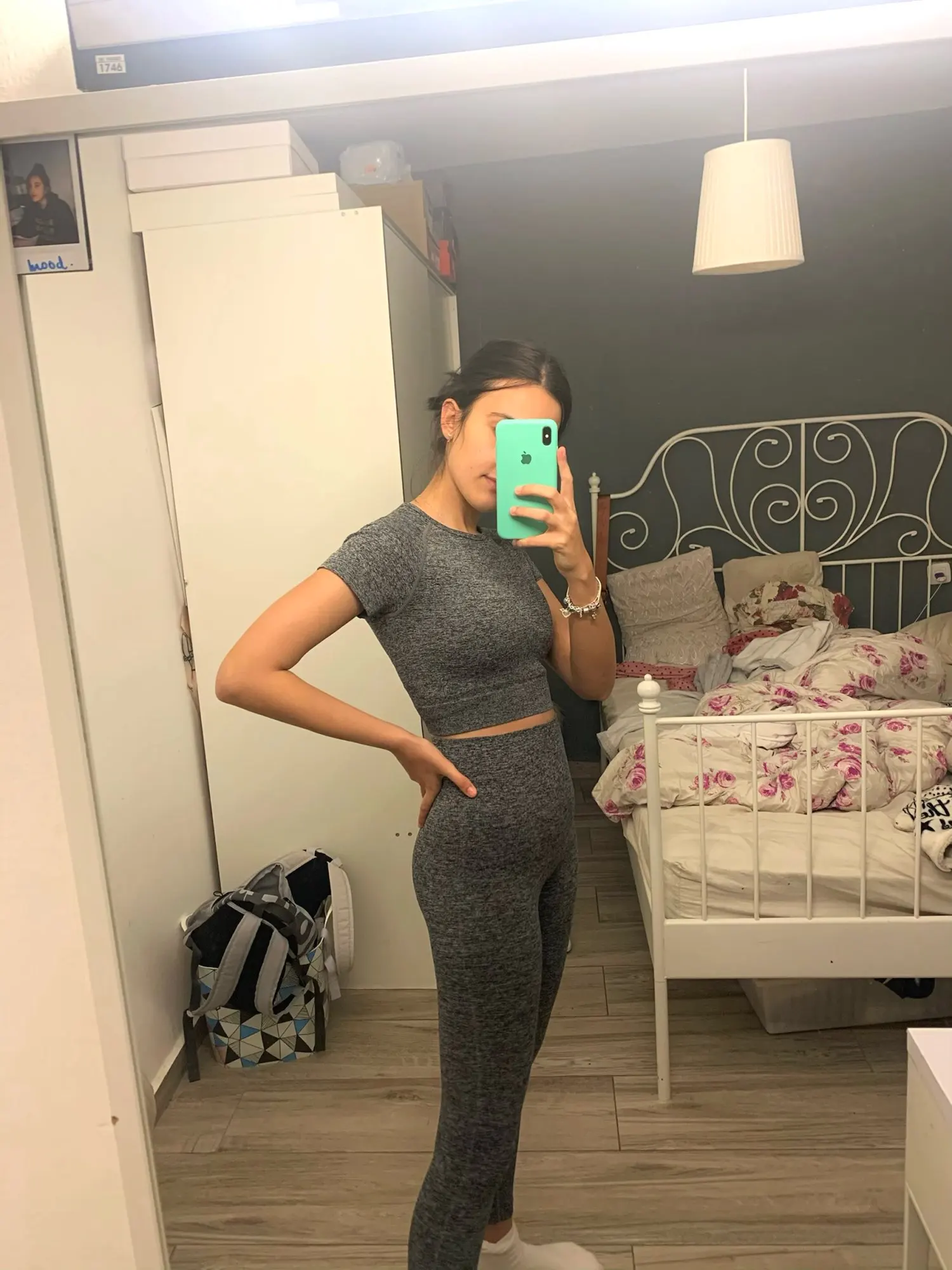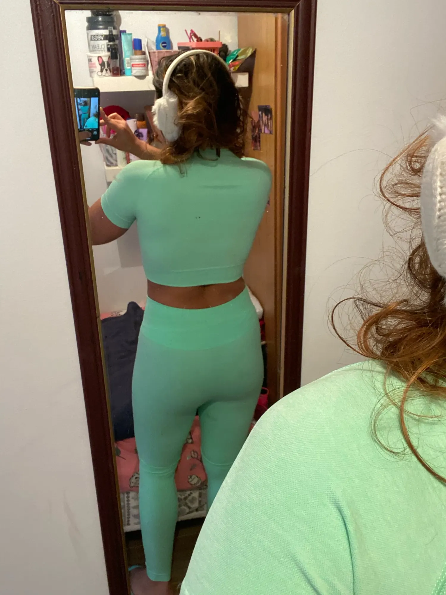 Мне очень нравится этот комплект, я купил маленький размер, и у меня есть 25-дюймовая Талия, а леггинсы-самые маленькие мешковатые, однако, если я немного свернул пояс, он хорошо сидит