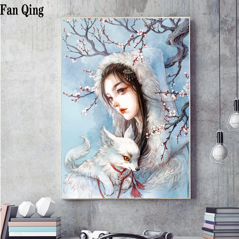 Алмазная вышивка сделай сам, Классическая красота и белая лиса, полноразмерная круглая алмазная живопись, Набор для вышивки крестиком, 5D мозаика, настенное искусство