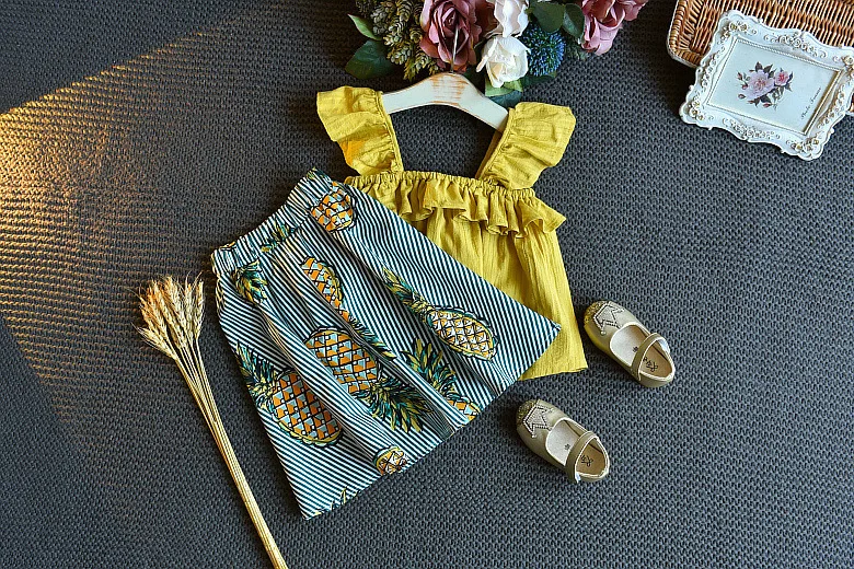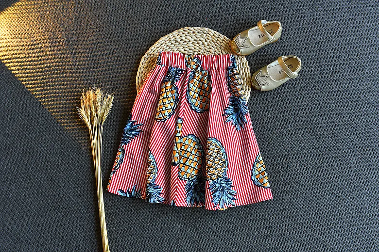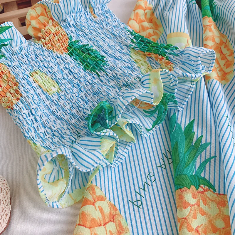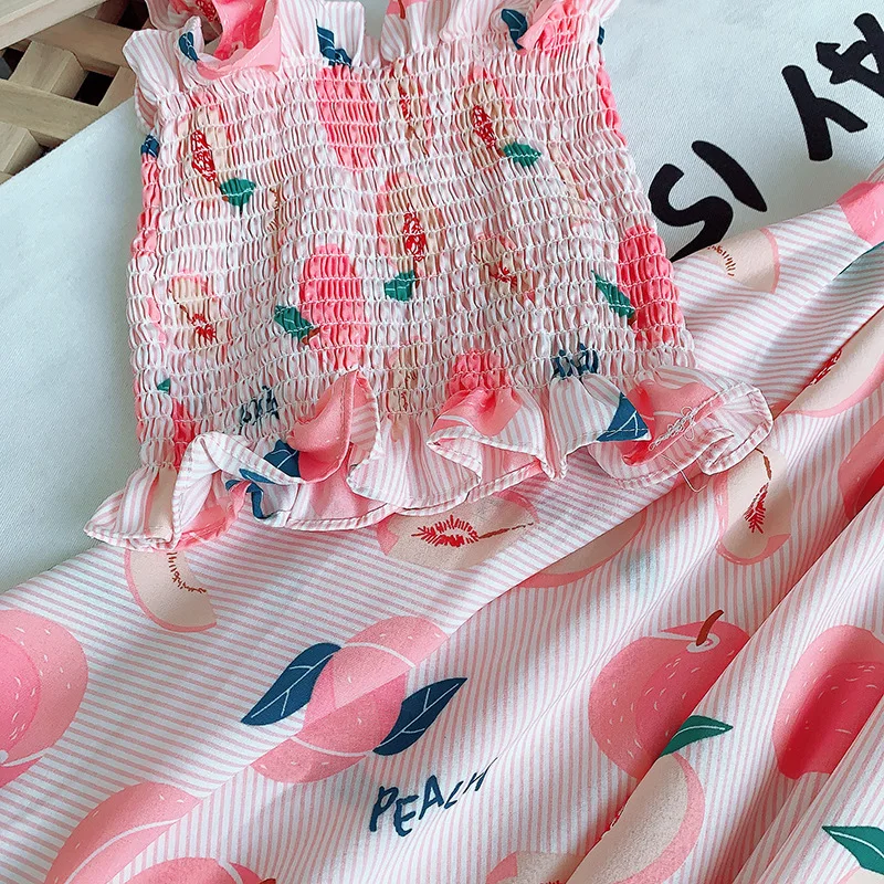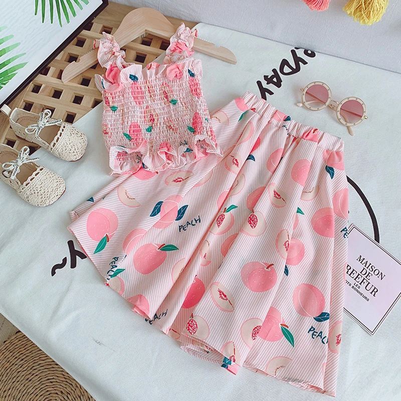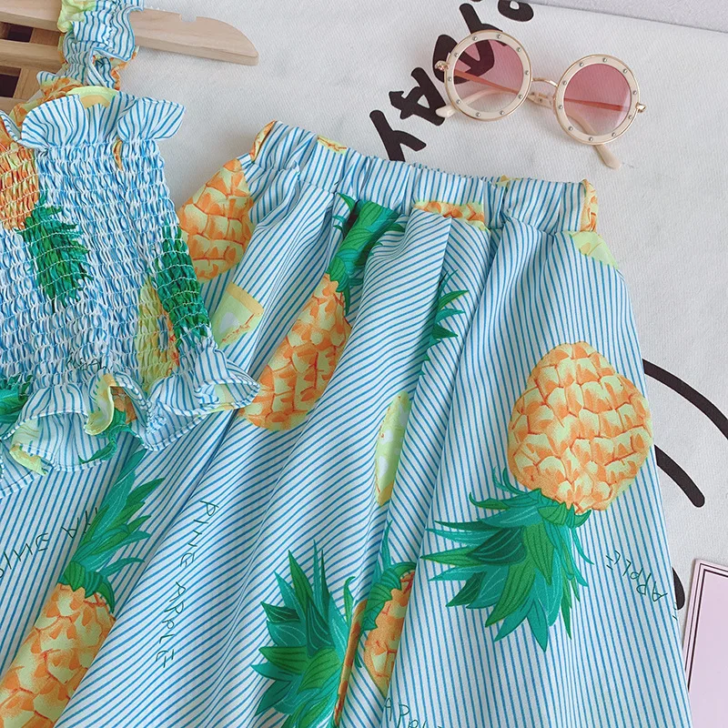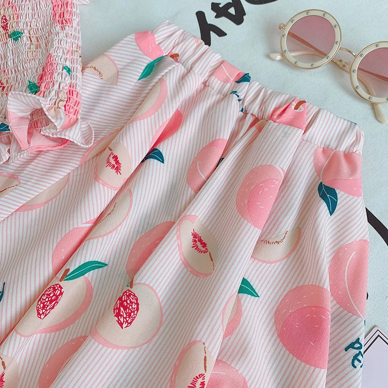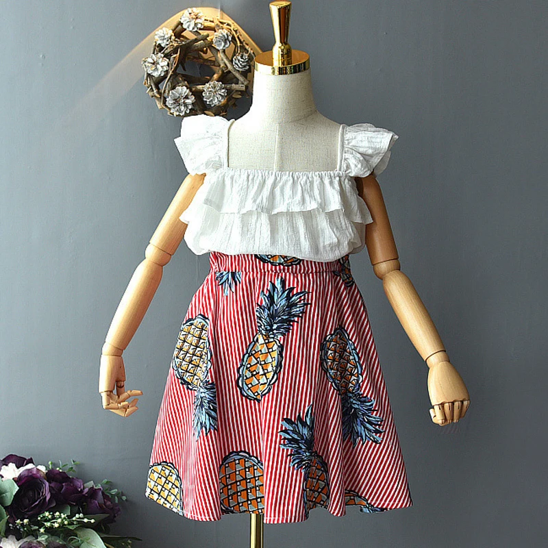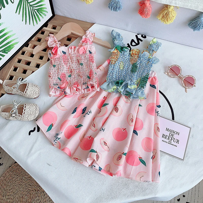 Комплект одежды для девочек, 2022, летняя Корейская Милая футболка без рукавов с фруктами + длинная юбка с высокой талией, Детский костюм, одежда для маленьких девочек