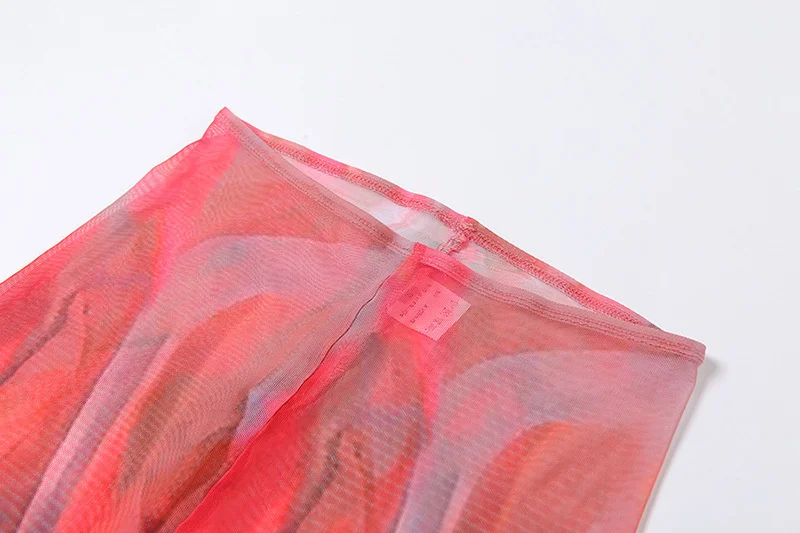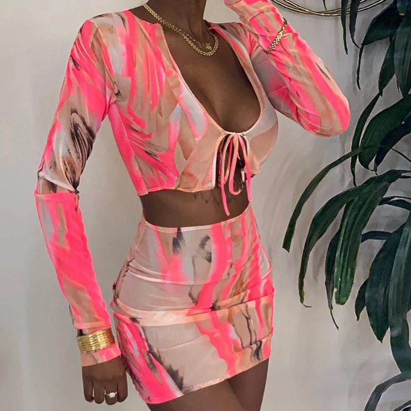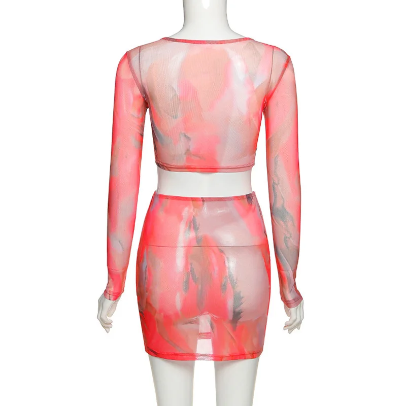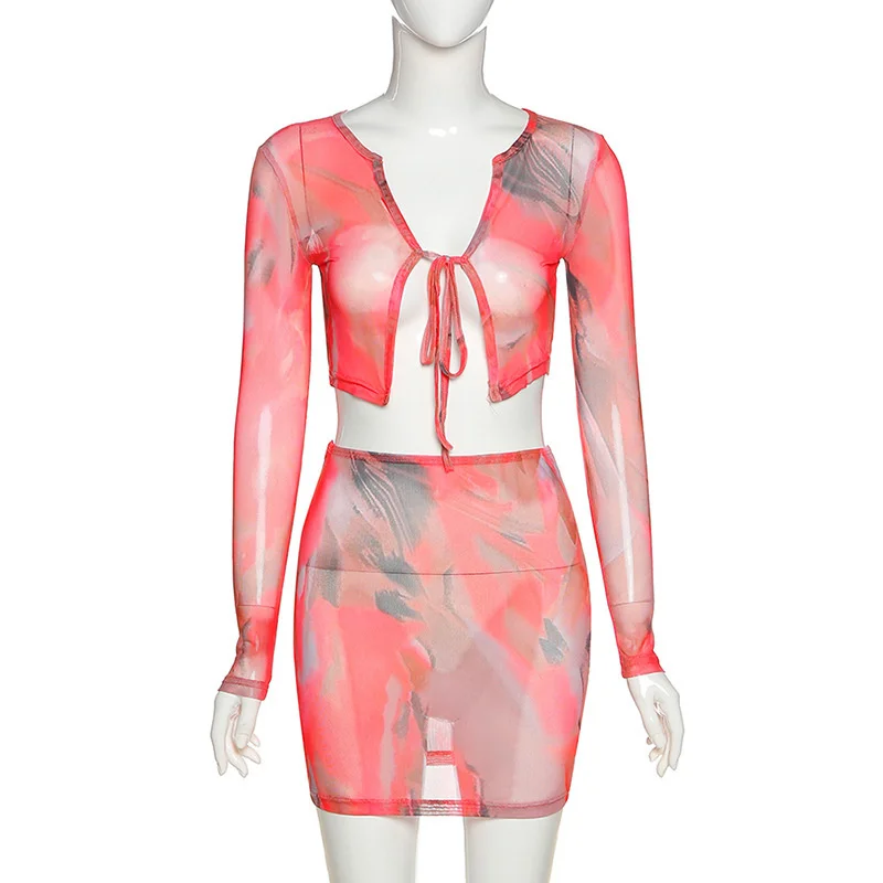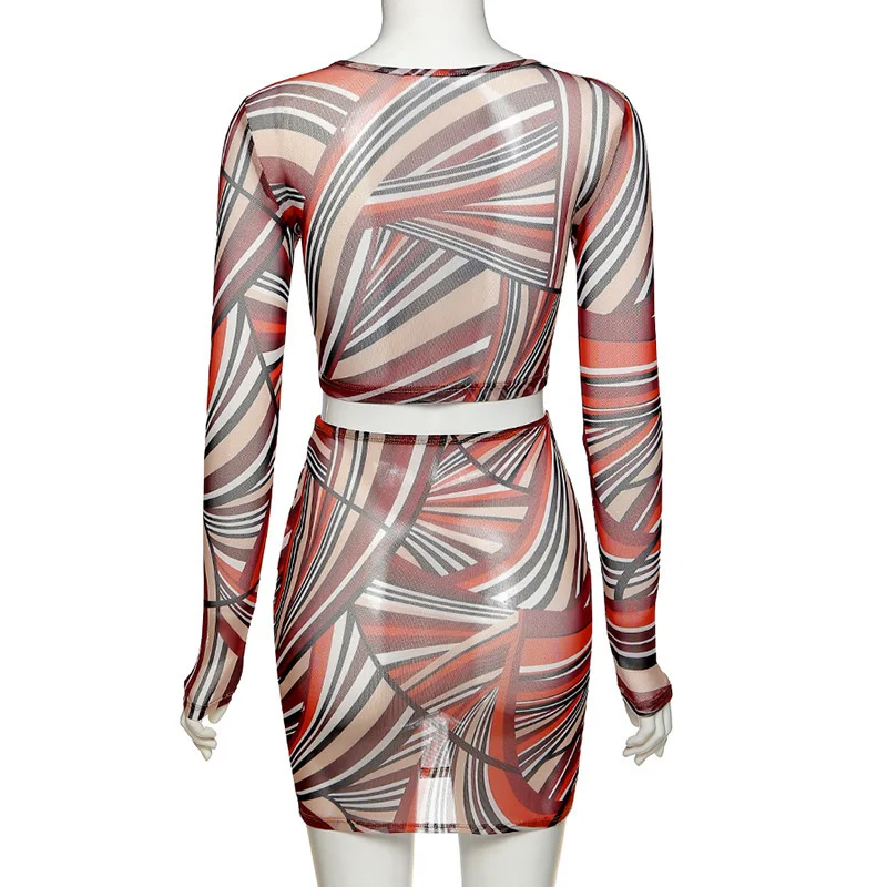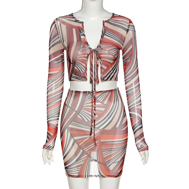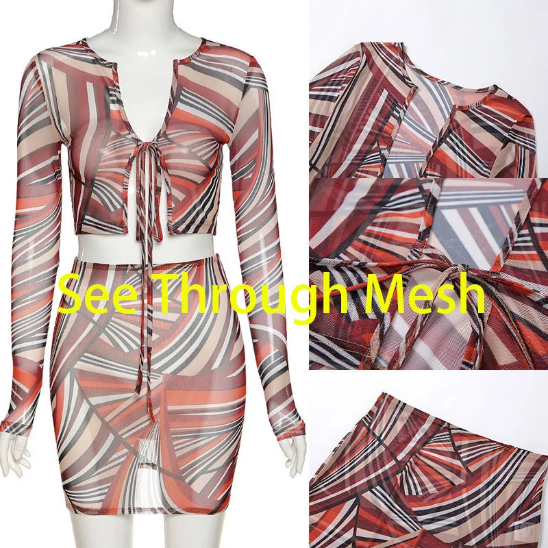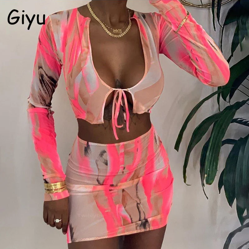 Женский сетчатый комплект из двух предметов Giyu с принтом, осень 2021, сексуальный прозрачный комплект из 2 предметов, кружевная Клубная юбка с глубоким V-образным вырезом, наряды для вечеринки