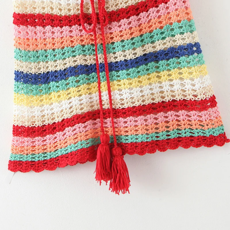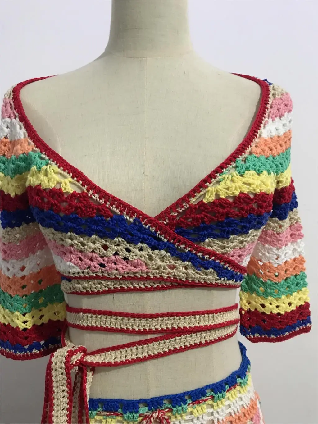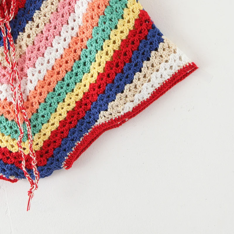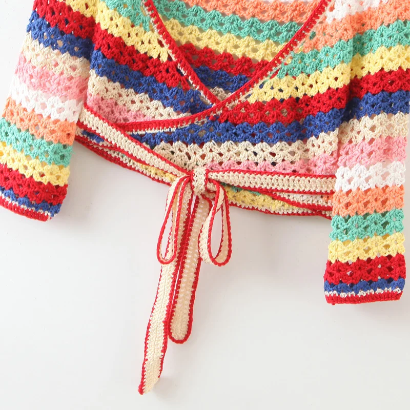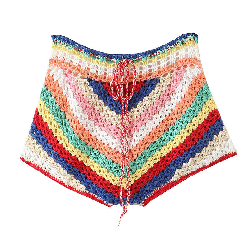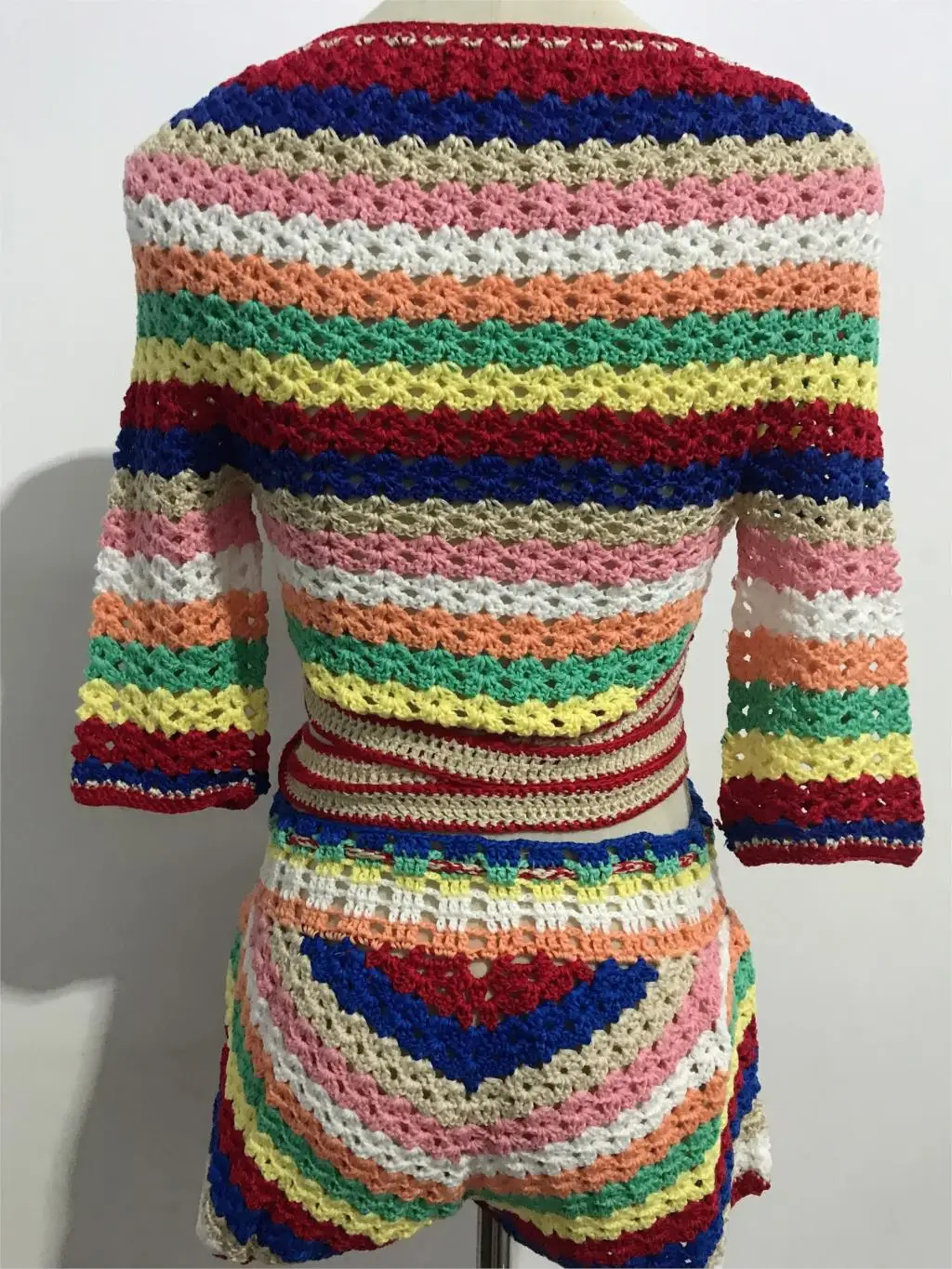 Женский вязаный кардиган в стиле бохо, разноцветный полосатый вязаный крючком кардиган, свитер, короткие шорты с коротким рукавом, комплект из 2 предметов, 2020