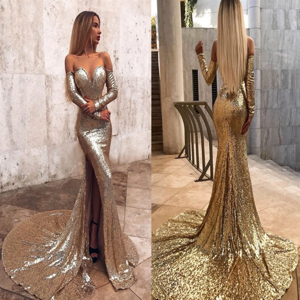 Великолепные золотые сексуальные вечерние платья с длинными рукавам...