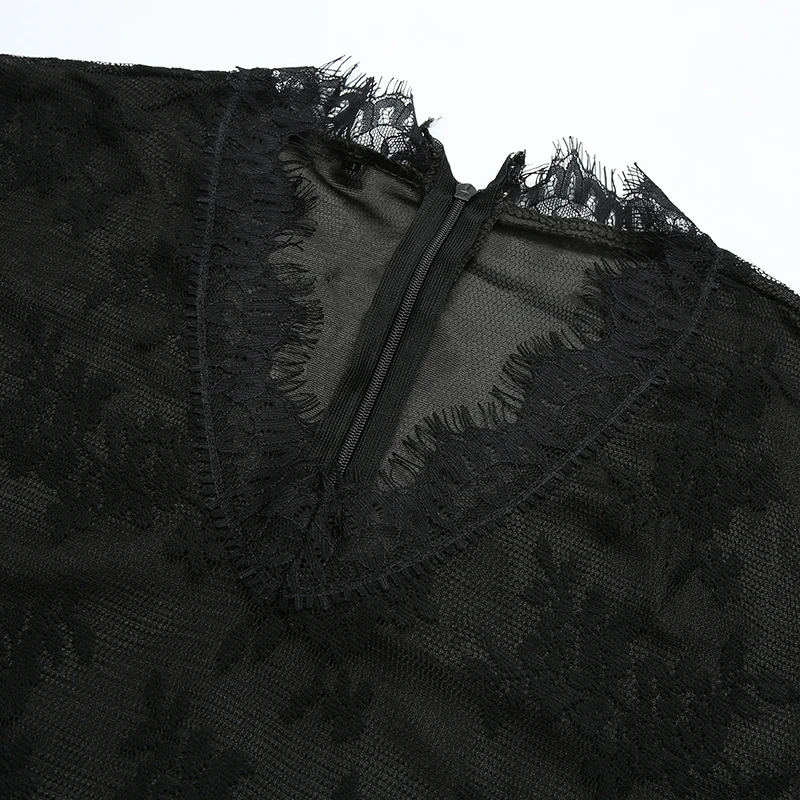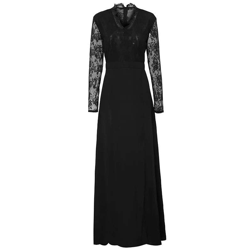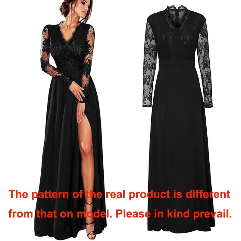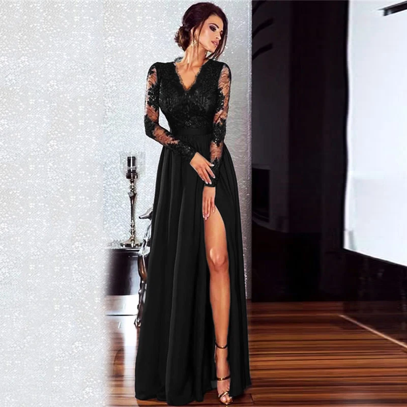 Черное кружевное платье для женщин, сексуальное длинное платье с глубоким V-образным вырезом и длинным рукавом, с разрезом по бокам, приталенное, потрясающее платье для вечеринки, 3XL, выпускное платье для дам