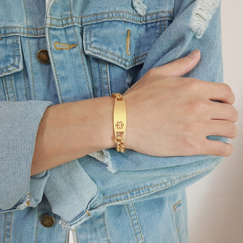 Общие причины ношения медицинской идентификации:(1) физическая аллергия, включая укусы насекомых, линзы, пищевые типы;(2) физические условия, включая сердечные состояния, судороги, обход желудка RNY;(3) медицинские аллергии, включая лекарственные средства, латекс, химикат;(4) медицинские условия, включая диабет, ITP, аутизм, альцгеймеры.Мы рекомендуем выгравировать:Ваше имя и фамилия