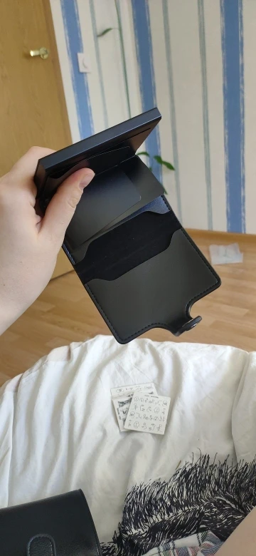 Хорошее качество, но бесполезно, карты вылетают из кошелька, и попадают на пол/табель, когда вы используете его.