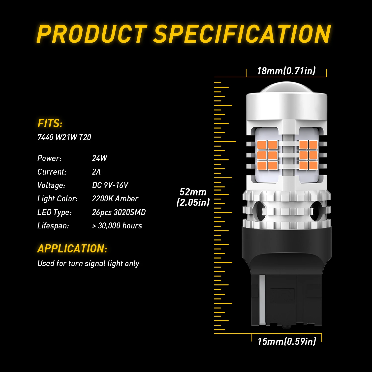 Подходящий тип вилки: 7440 W2W T20 (не для 7443)Мощность: 24 ВтТок: 2АНапряжение: 9 В-16 В постоянного токаЦвет светильник: Янтарный 2200 кСветодиодный да: 26 шт 3020SMDСрок службы: >30 000 часов