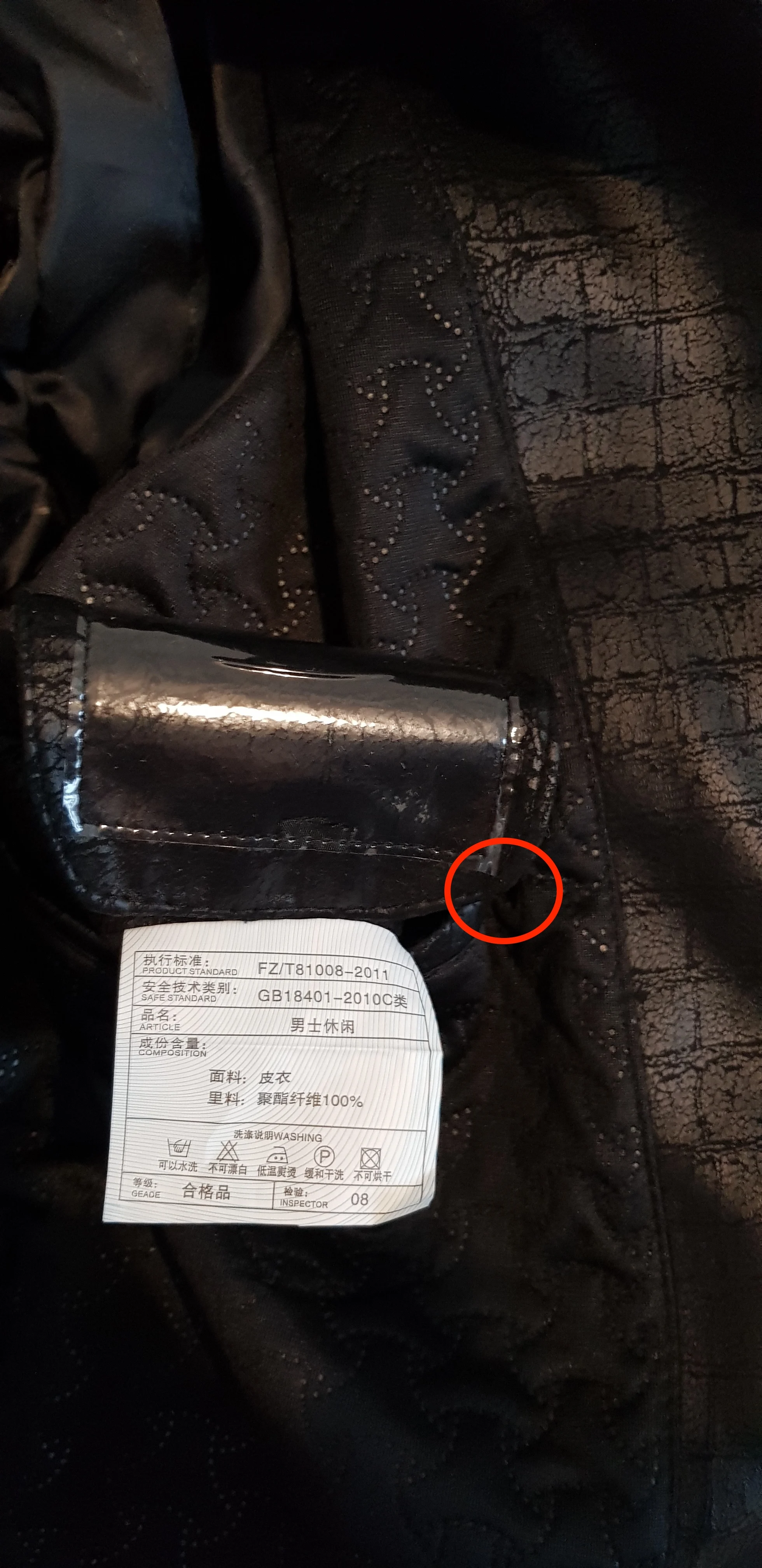 Куртка не из кожи. Я доставил его в кожевенный магазин, и они сказали, что это просто полиэстер. Его еще более плохое качество, чем PU. Продавец не хочет признавать, что это подделка, поэтому я сделаю спор о обмане. Этот вид качества стоит 20 евро,-. Внутри пальто в внутреннем кармане есть зазор, и вы можете ясно видеть, что это просто полиэстер на задней части ткани/искусственная кожа. Я облетел место, где находится изображение с увеличенной полнотой. Все вы предупреждены об этой компании.
