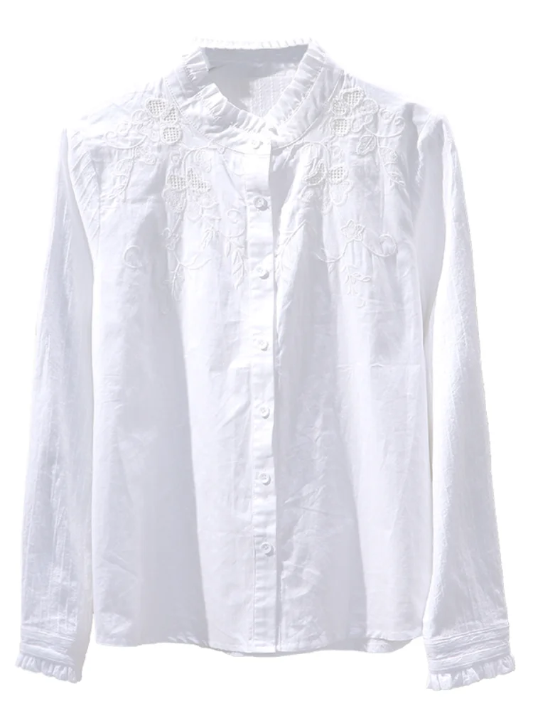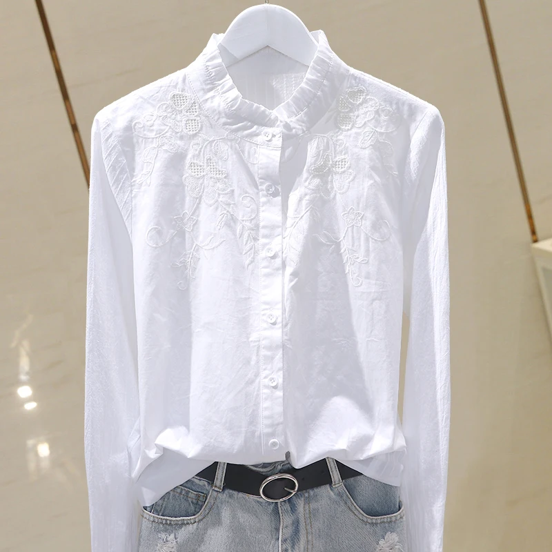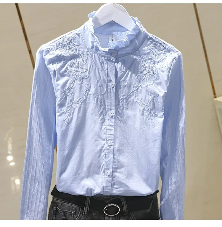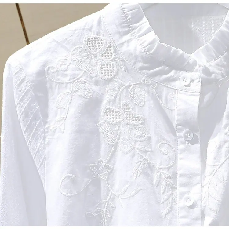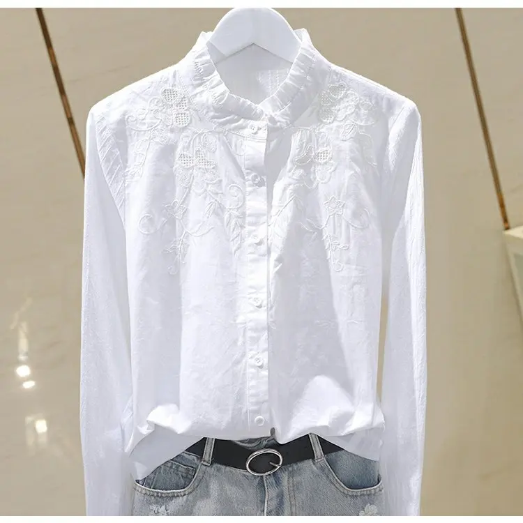 Женская рубашка с вышивкой, однотонная приталенная рубашка с длинными рукавами и оборками, элегантная верхняя одежда, лето 2021