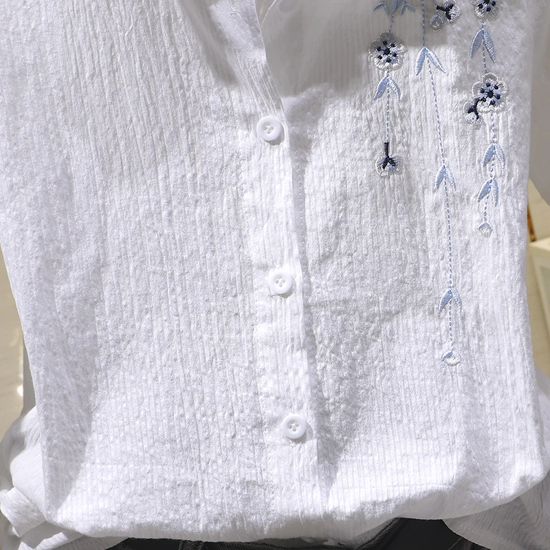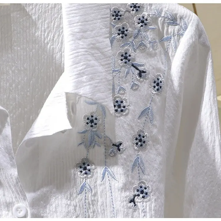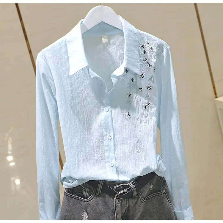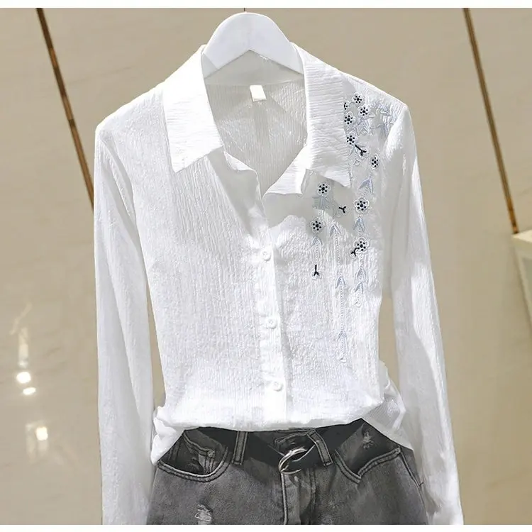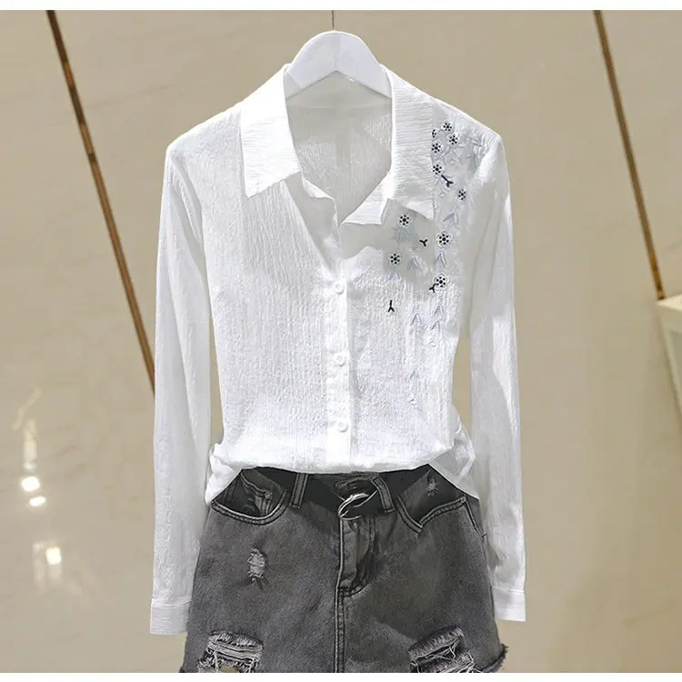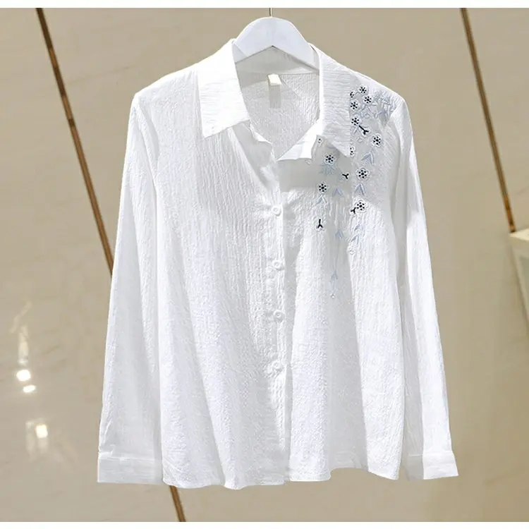 Хлопковые женские рубашки с цветочной вышивкой 2021 Летние Новые однотонные женские рубашки с длинным рукавом и отложным воротником Верхняя одежда Топы