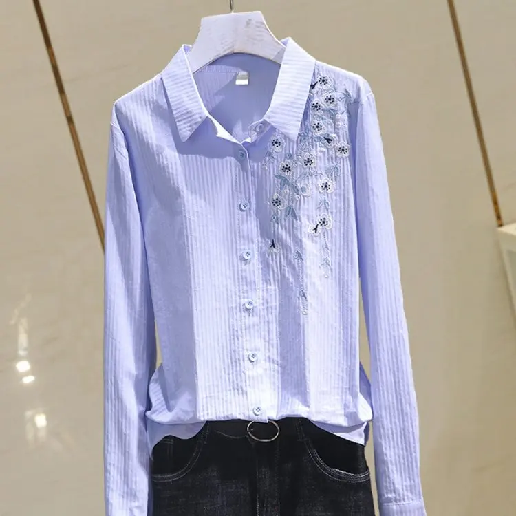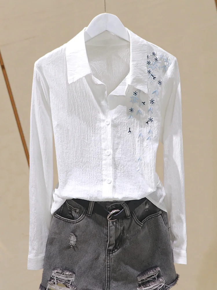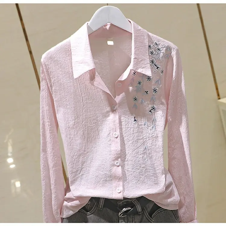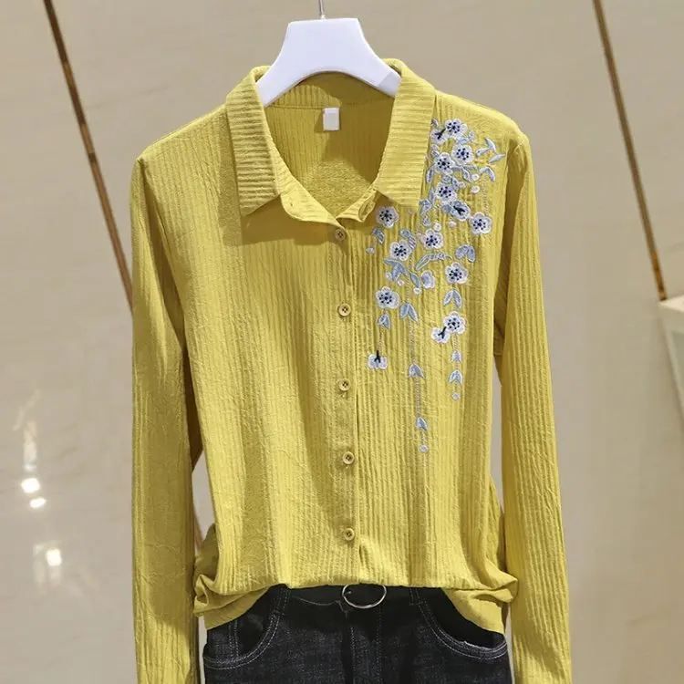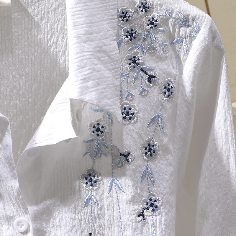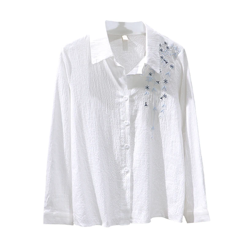 Хлопковые женские рубашки с цветочной вышивкой 2021 Летние Новые однотонные женские рубашки с длинным рукавом и отложным воротником Верхняя одежда Топы
