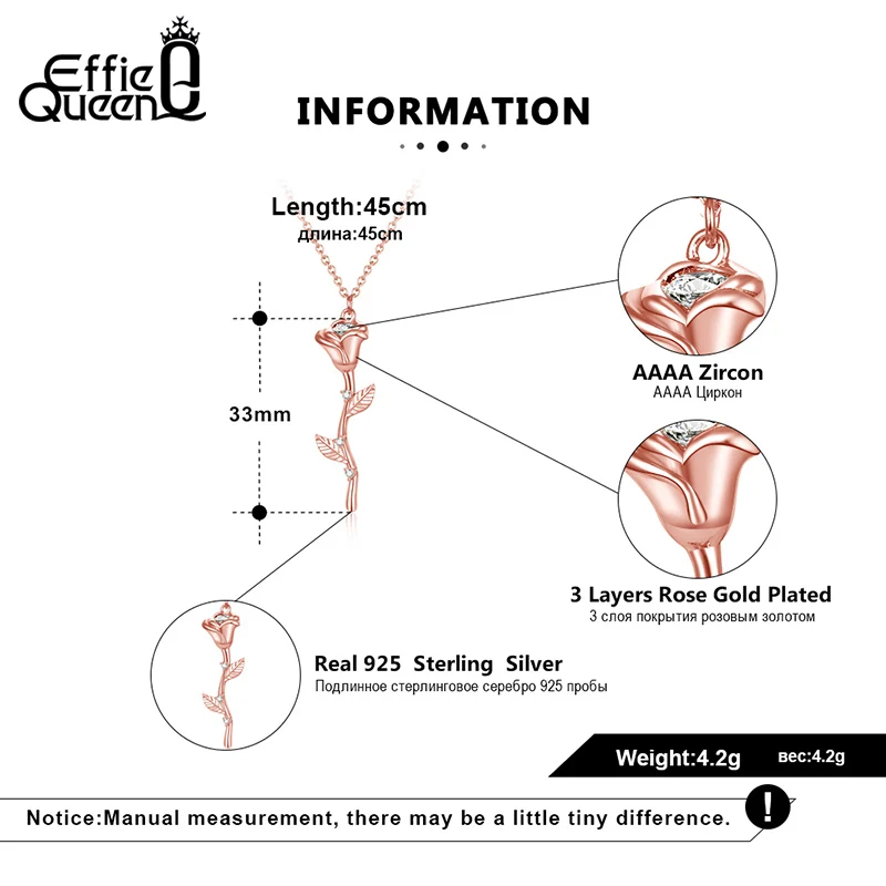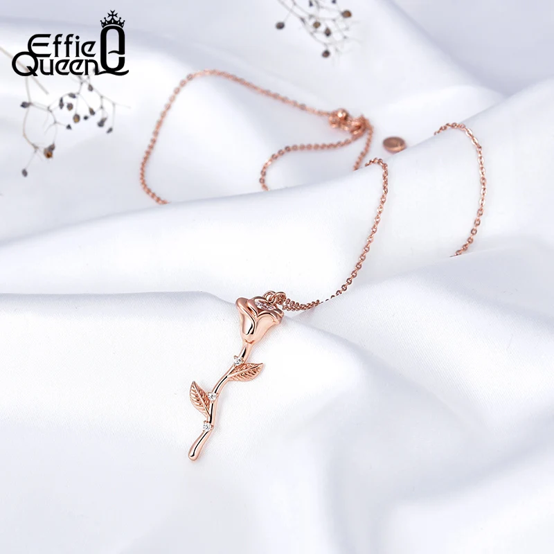 Effie Queen, романтическое ювелирное изделие для влюбленных, подарок, 100% Серебро 925 пробы, в форме цветка розы, длинное ожерелье, ювелирное изделие, свадебный подарок EQN07