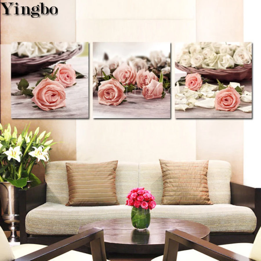 Полностью квадратнаякруглая Алмазная картина, розовые розы, цветы, вышивка, алмаз, 3 шт.набор, мозаичные картины, стразы, Декор, искусство